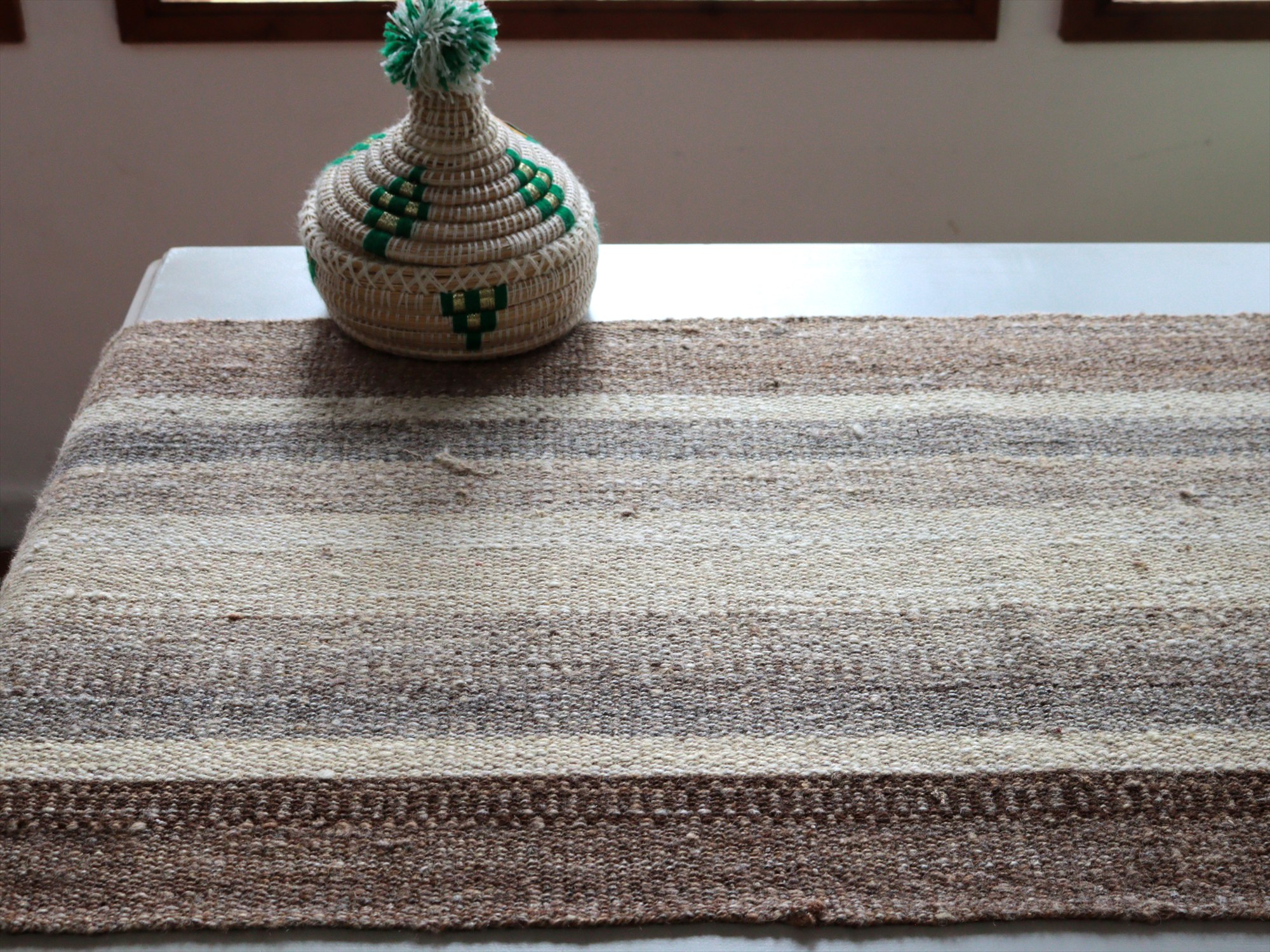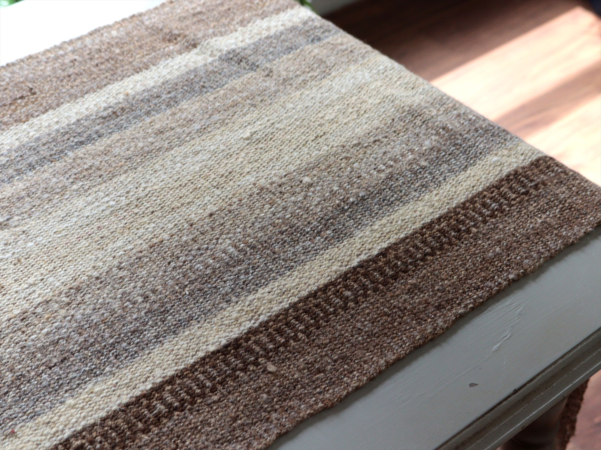 トルコ北東部、カルス地方で織られたキリム。アイボリーとブラウン、グレーの組み合わせで、ストライプが表現されたシンプルなデザイン。