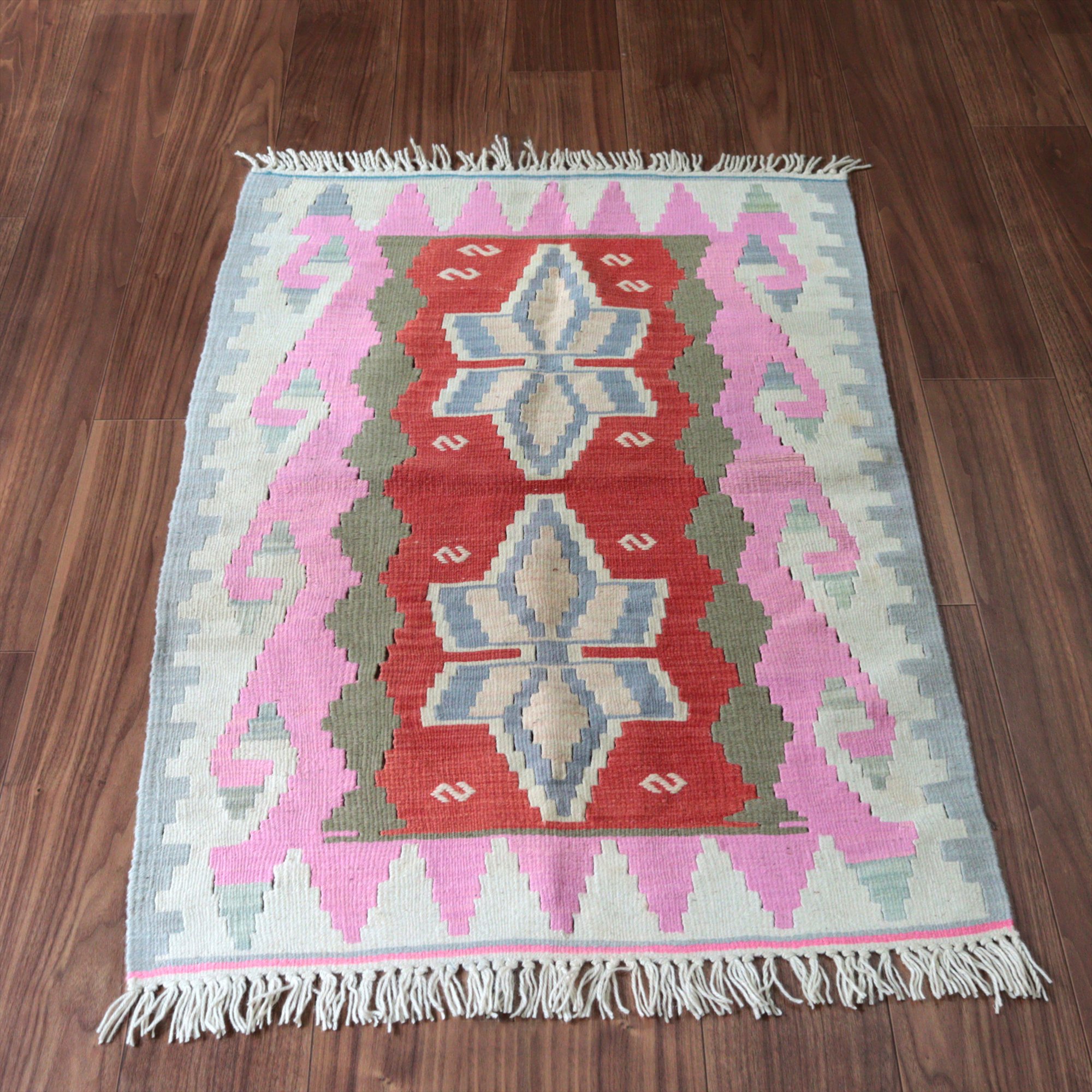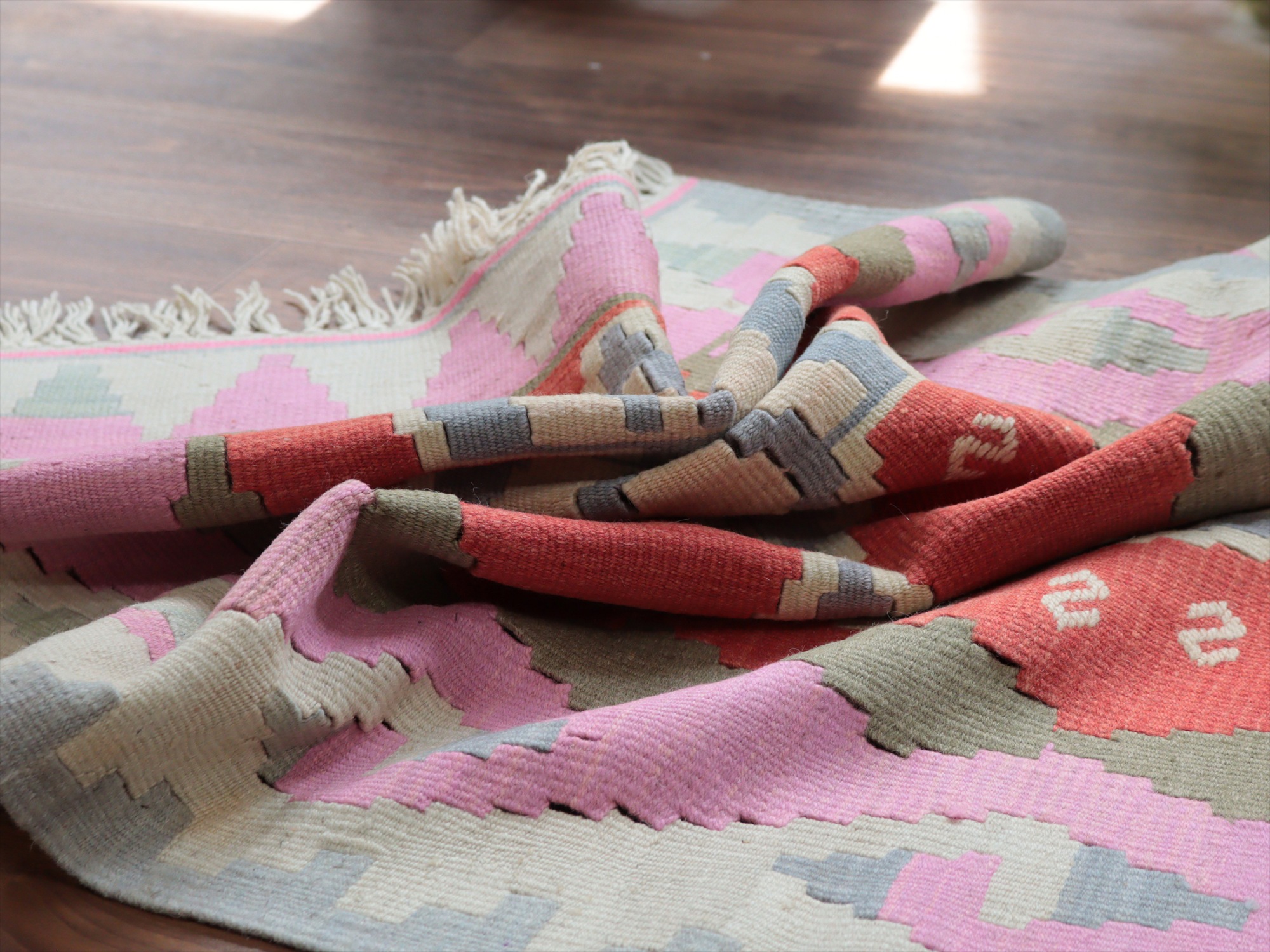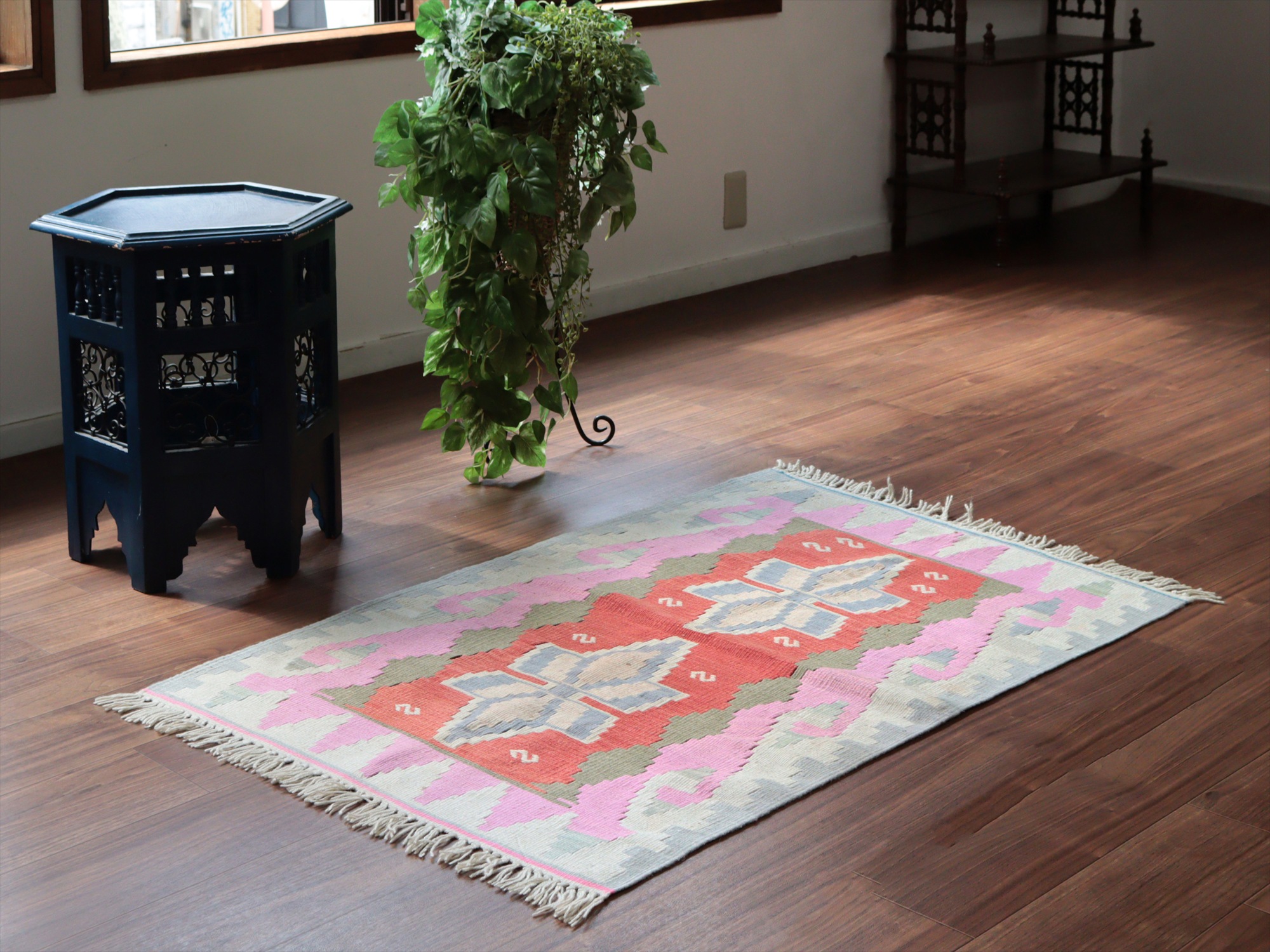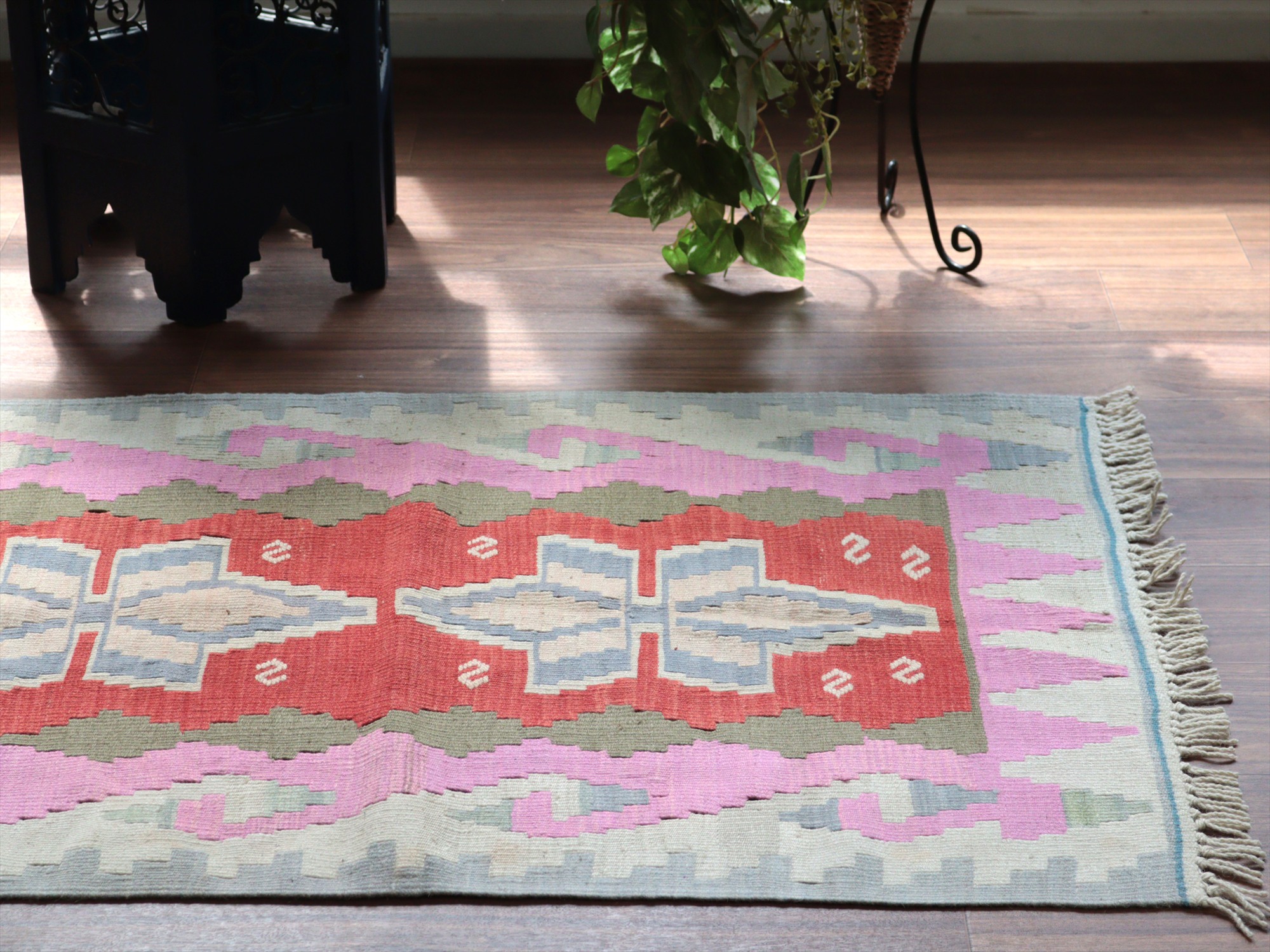 カイセリ産手織りキリム115×77cm レッド&ピンク トルコの手織りラグ