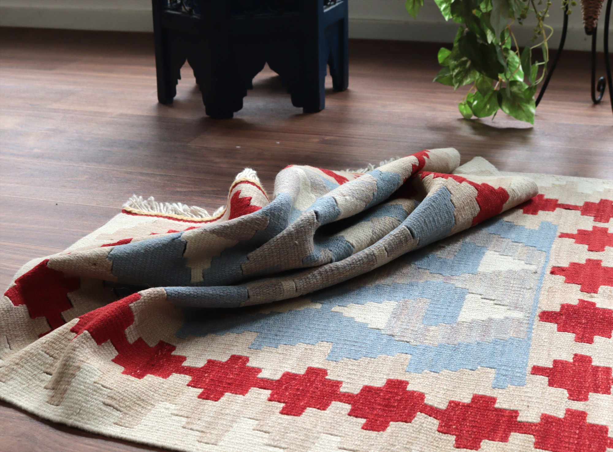 - カイセリ産手織りキリム 雄羊の角115×79cm ブルー&グレー トルコの手織りラグ