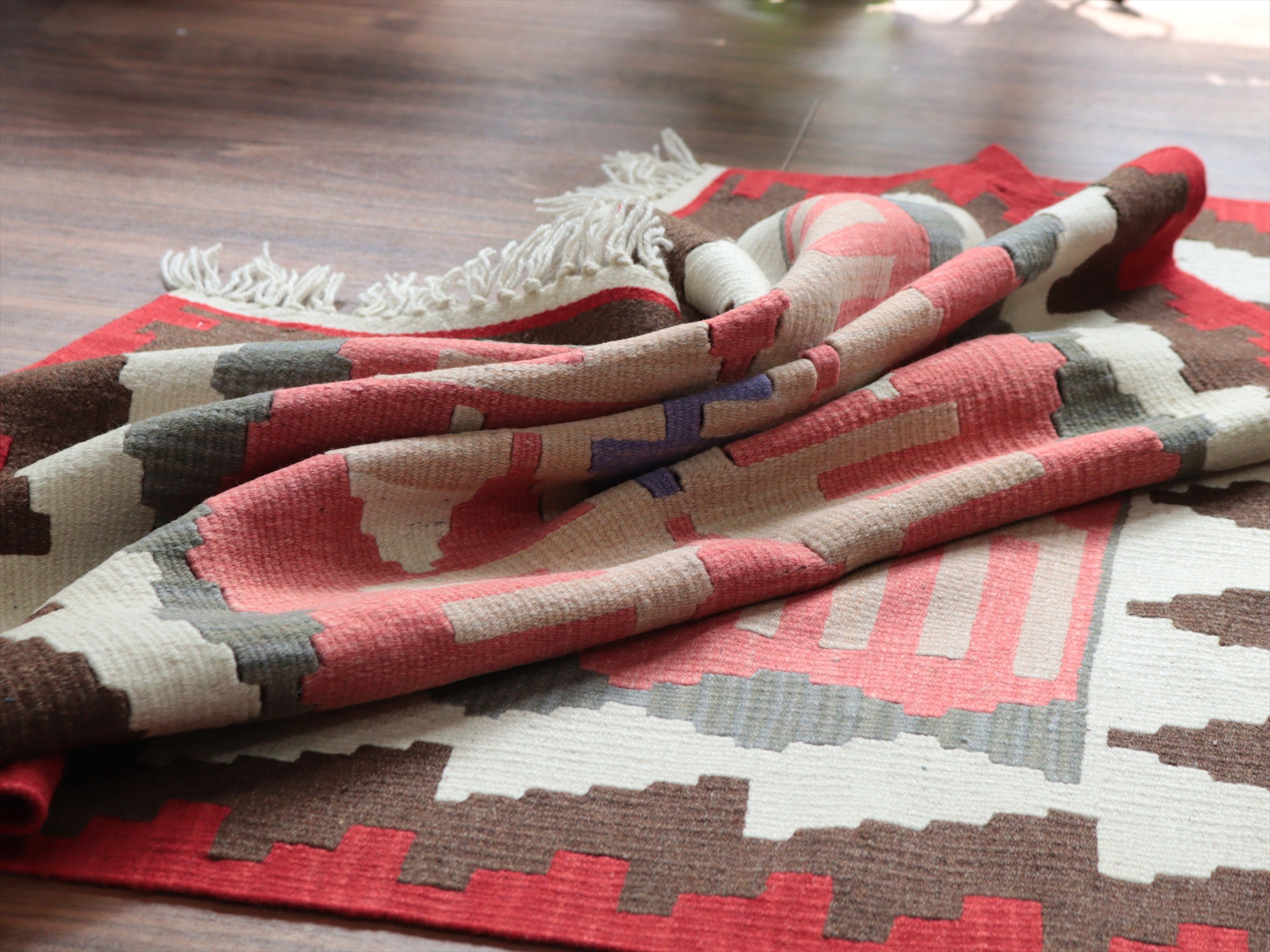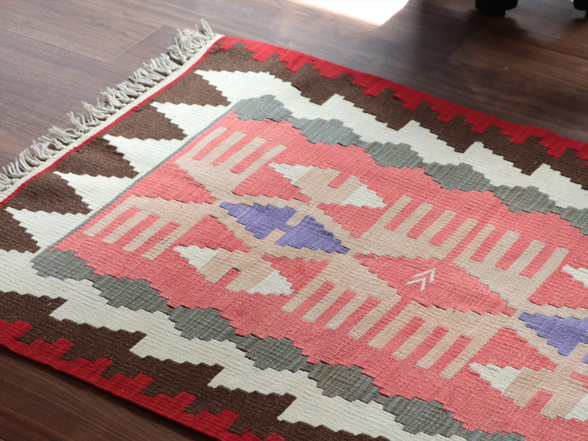 織り地がしなやかでやわらかいのがカイセリキリムの特徴です。やや厚みがあり、やさしい肌触り。色の切り替え部分には、キリムの織りの特徴で、縦に隙間が開いています(スリットと呼んでいます)。