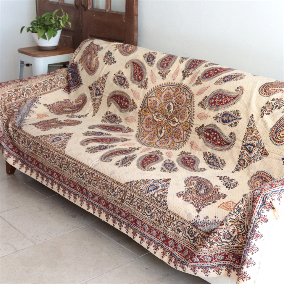 Key:コットン 染色 ブロックプリント 木版 捺染 伝統工芸 ペルシャブルー ペイズリー フリークロス マルチカバー ベッドスプレッド ベッドカバー ソファカバー カーテン タペストリー ファブリック インテリアファブリック クラフト インテリア ペルシャ ペルセポリス イラン 中東 シルクロード アジアン エスニック