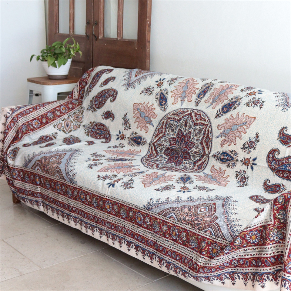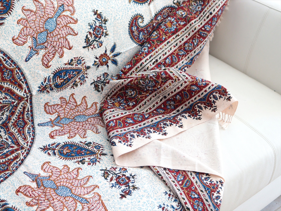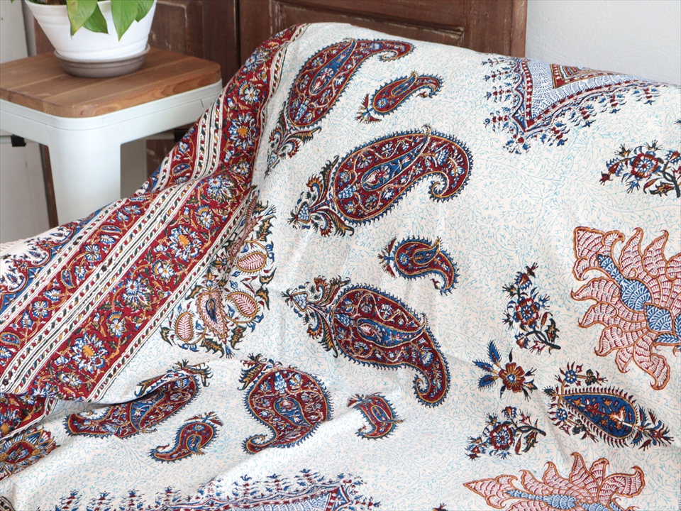 Key:コットン 染色 ブロックプリント 木版 捺染 伝統工芸 ペルシャブルー ペイズリー フリークロス マルチカバー ベッドスプレッド ベッドカバー ソファカバー カーテン タペストリー ファブリック インテリアファブリック クラフト インテリア ペルシャ ペルセポリス イラン 中東 シルクロード アジアン エスニック