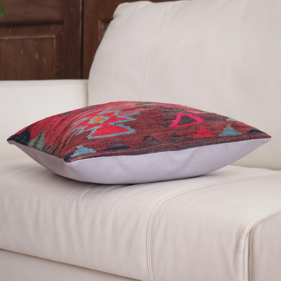 中央部分は青、ボーダー(額縁)は赤色、ボーダーには赤やピンクのベレケットのモチーフを置いた鮮やかな色合いのキリムからのカット。こちらはキリムのコーナー部分にあたります。赤と青色には色の濃淡が見られます。もともとこのような色合いだったのか経年変化による褪色かさだかではありませんけれども、オールドならではのきれいな色合いになっています。