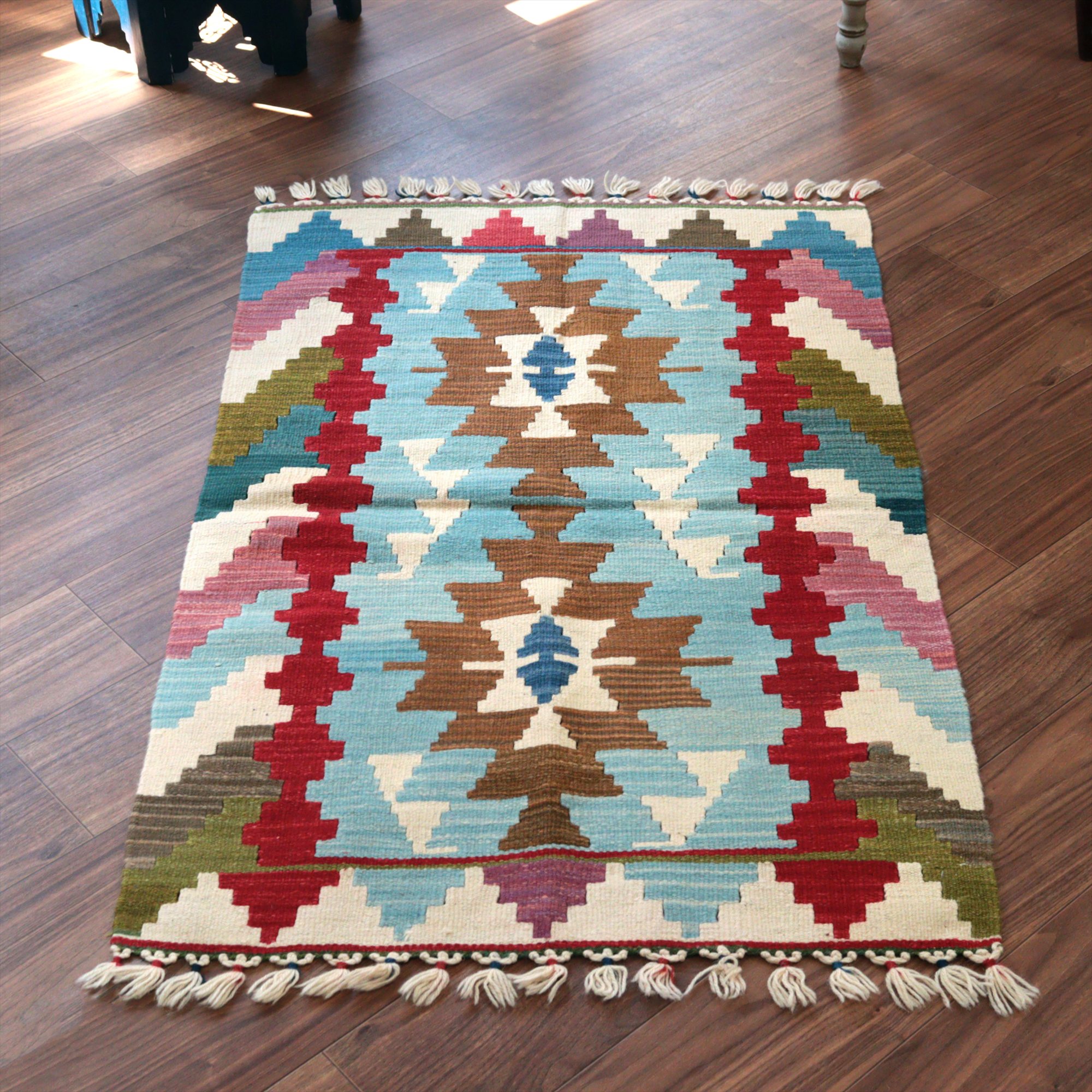 - カイセリ産手織りキリム114×75cm ライトブルー トルコの手織りラグ