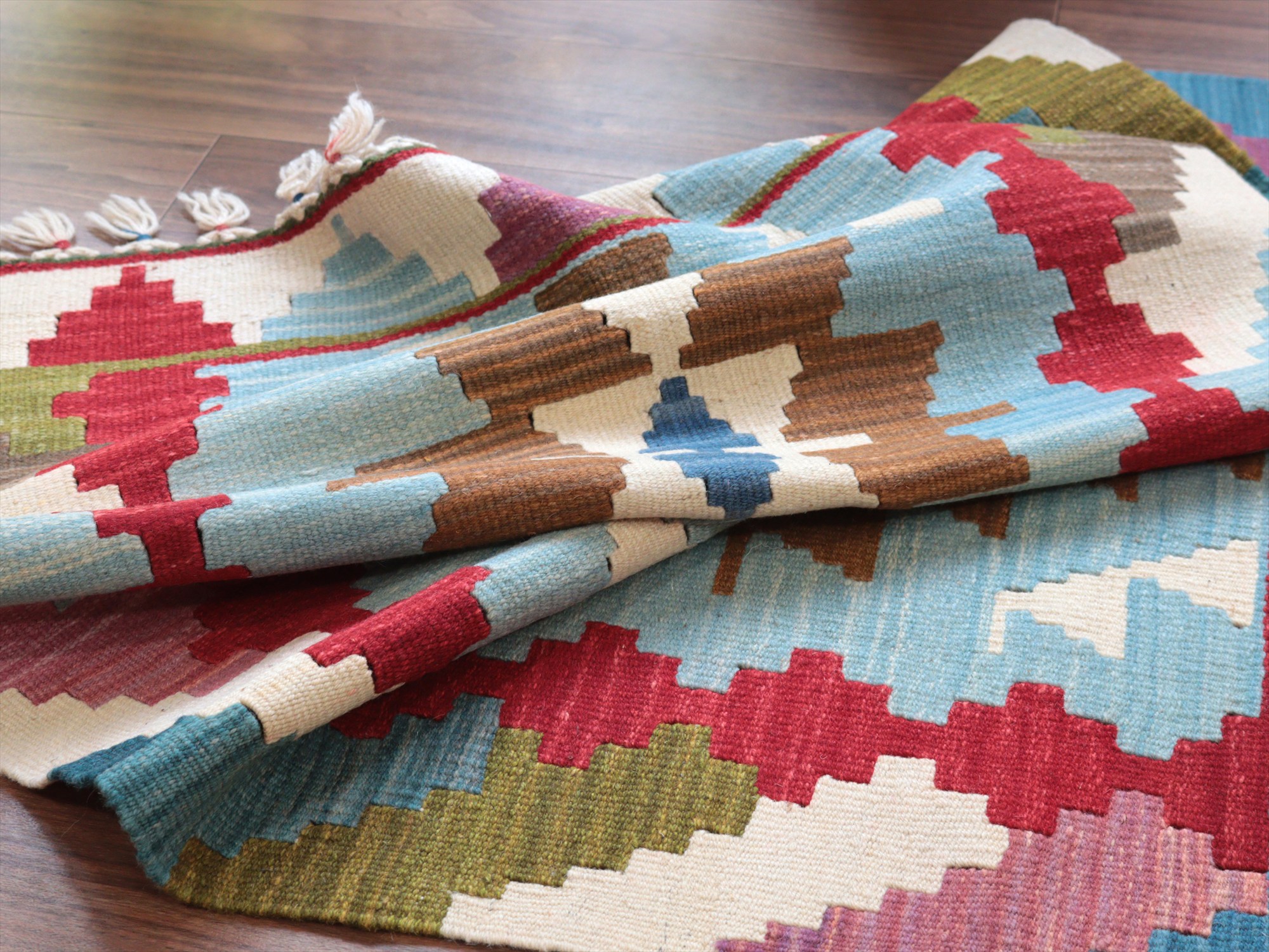 織り地がしなやかでやわらかいのがカイセリキリムの特徴です。やや厚みがあり、やさしい肌触り。色の切り替え部分には、キリムの織りの特徴で、縦に隙間が開いています(スリットと呼んでいます)。