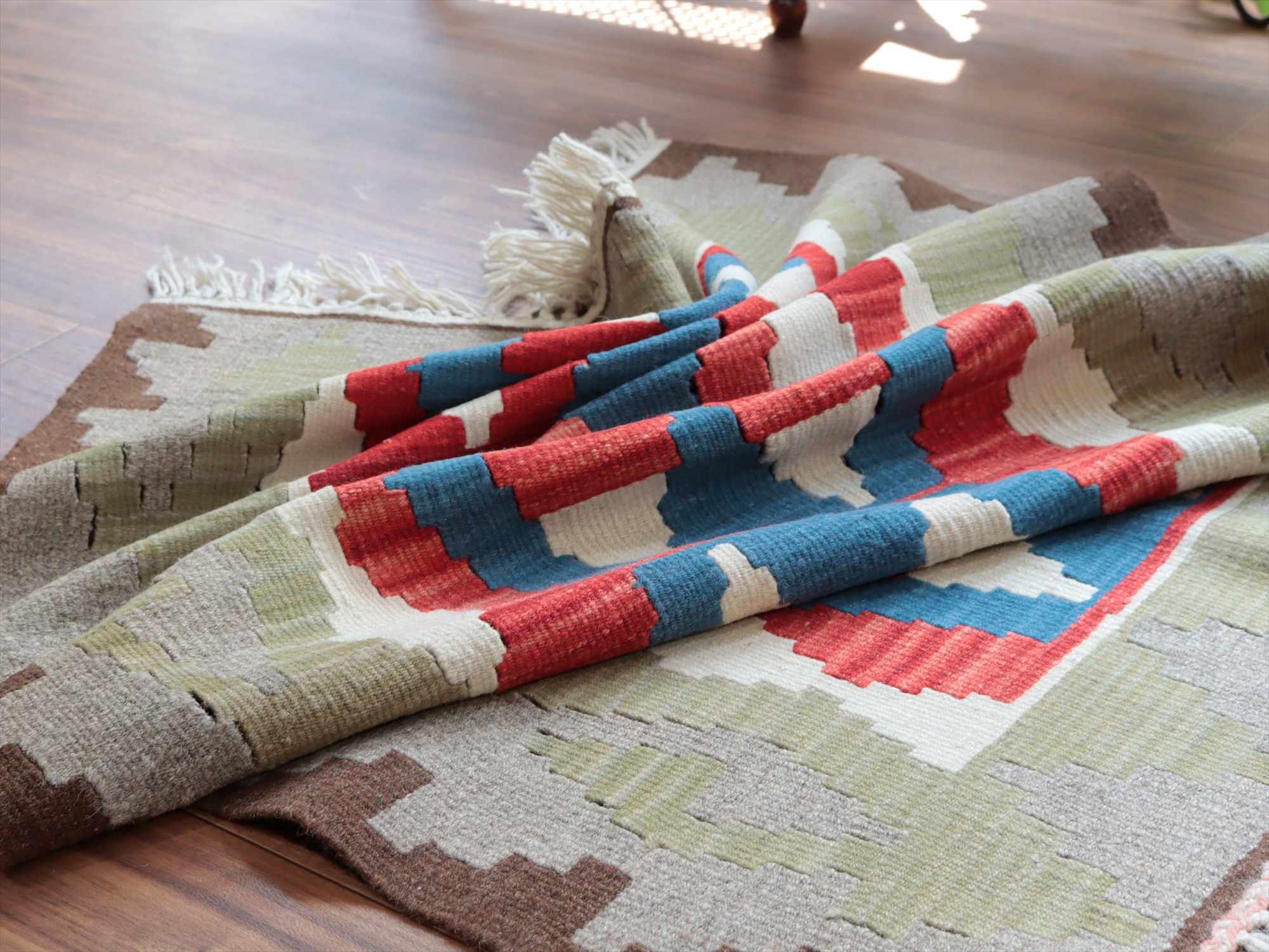 織り地がしなやかでやわらかいのがカイセリキリムの特徴です。やや厚みがあり、やさしい肌触り。色の切り替え部分には、キリムの織りの特徴で、縦に隙間が開いています(スリットと呼んでいます)。