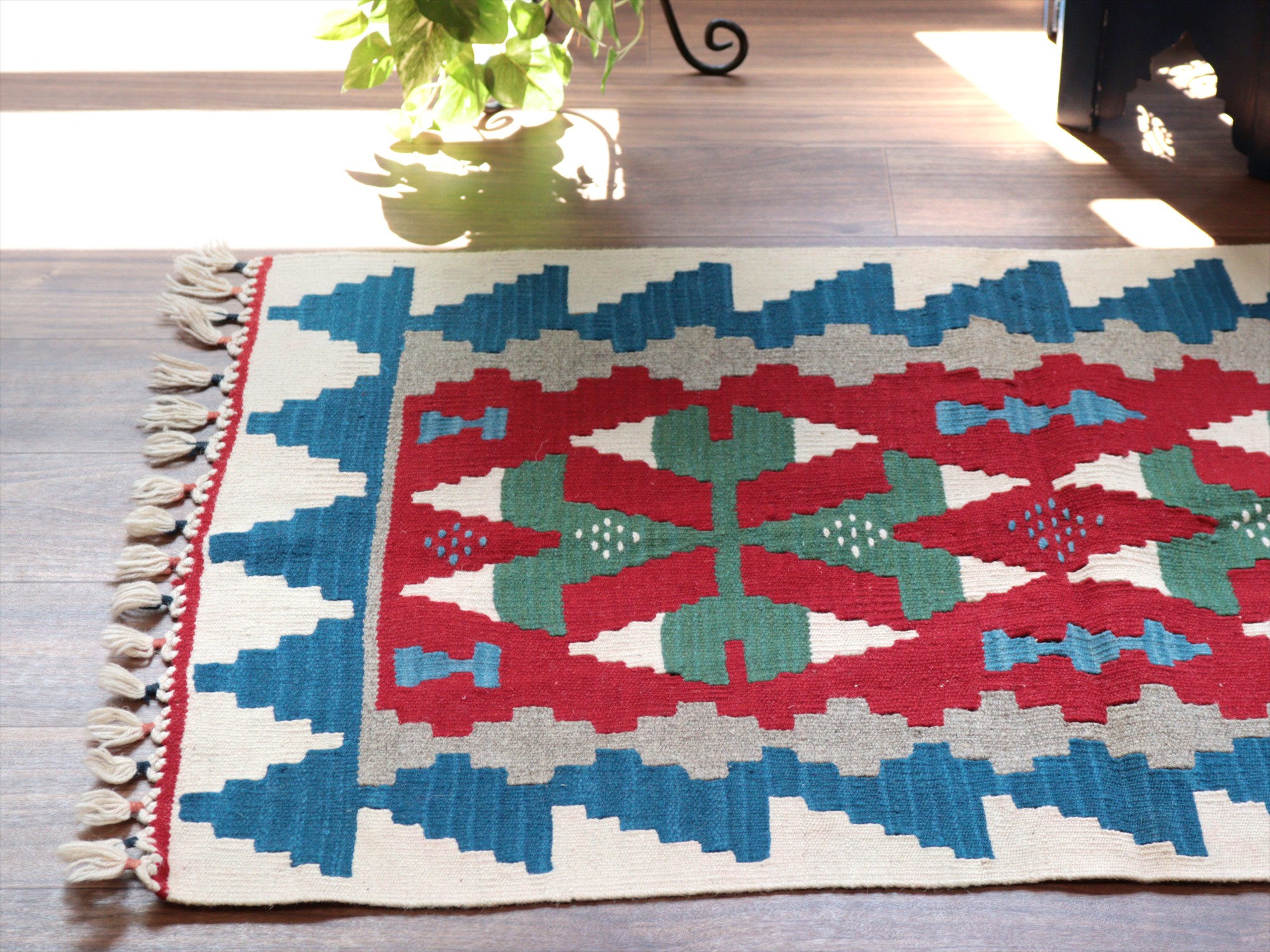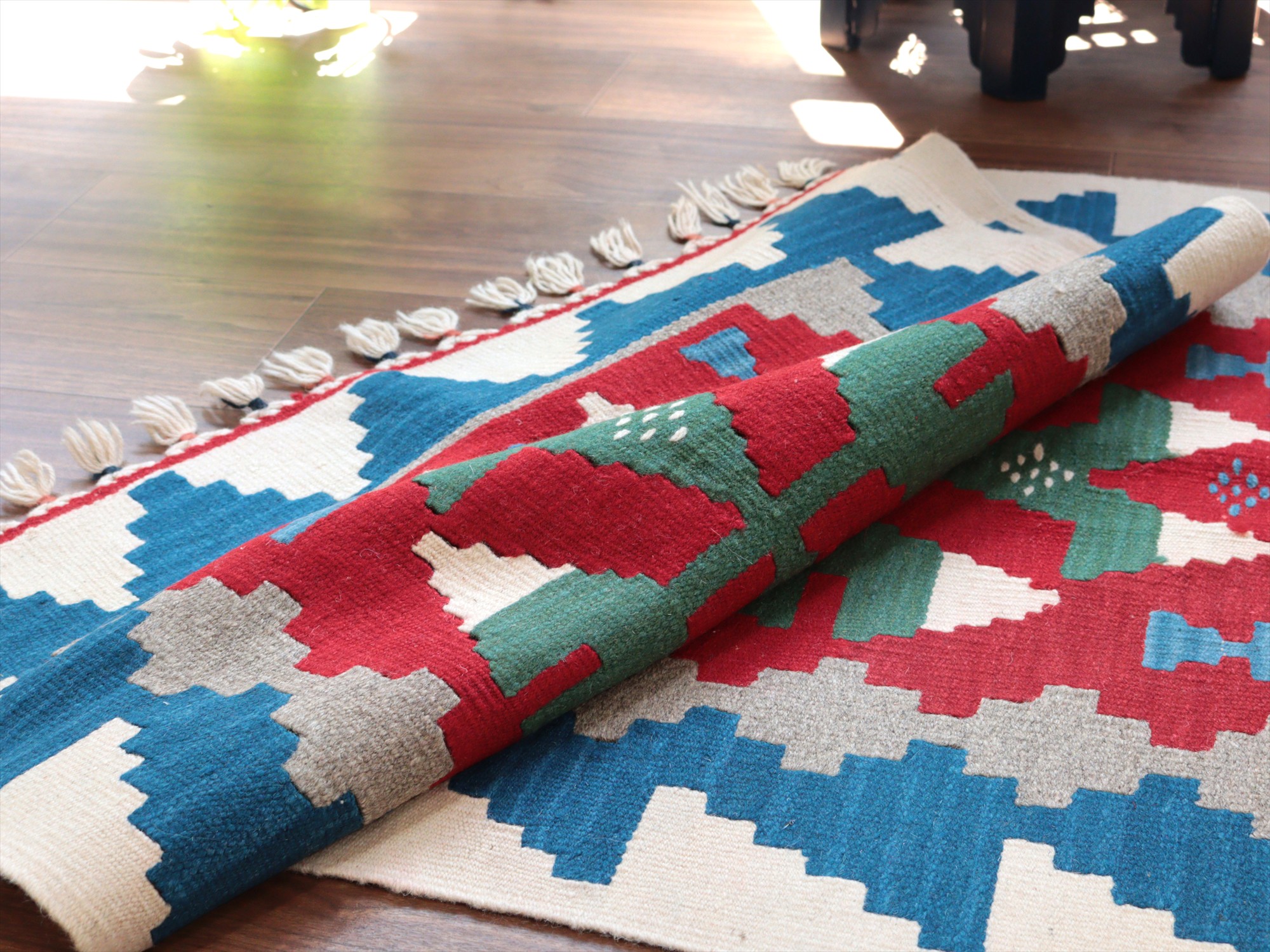 - カイセリ産手織りキリム110×75cm レッド&ブルー トルコの手織りラグ