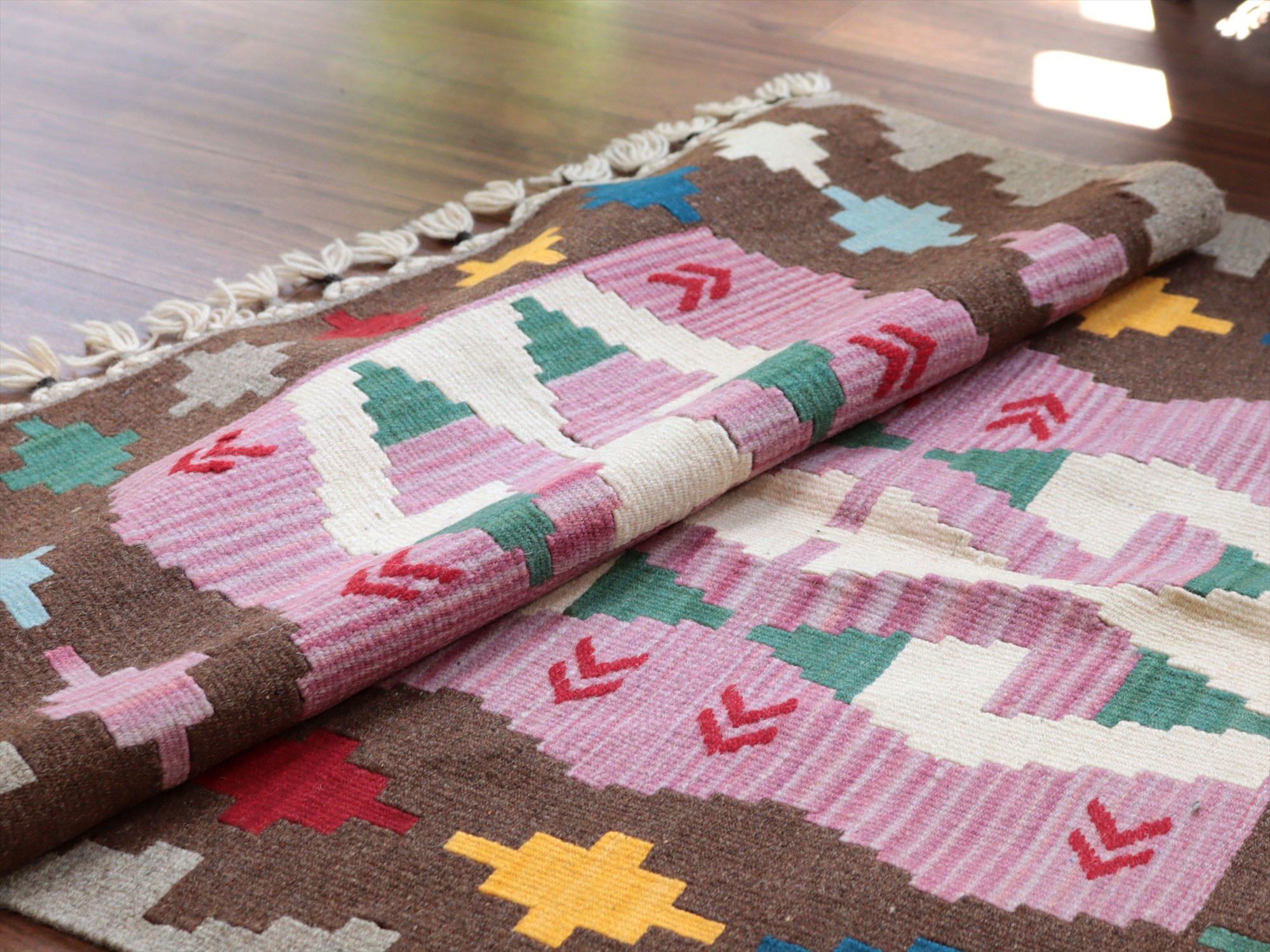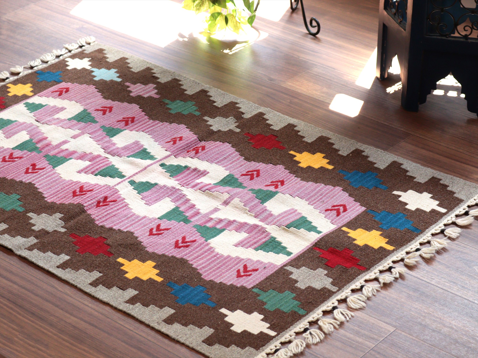 パープルとブラウンを基調とした色使いで織られたカイセリキリム。レッド、イエロー、ブルーなど発色の良い色も使われていてアクセントになっています。