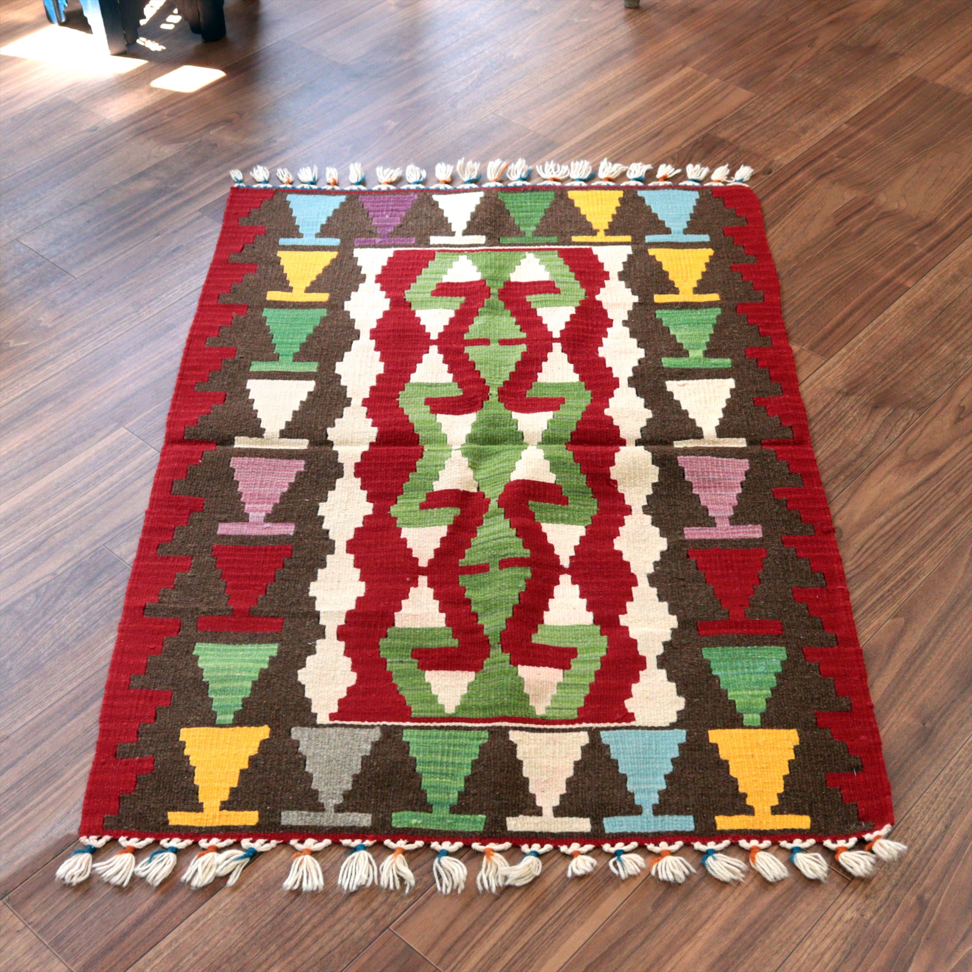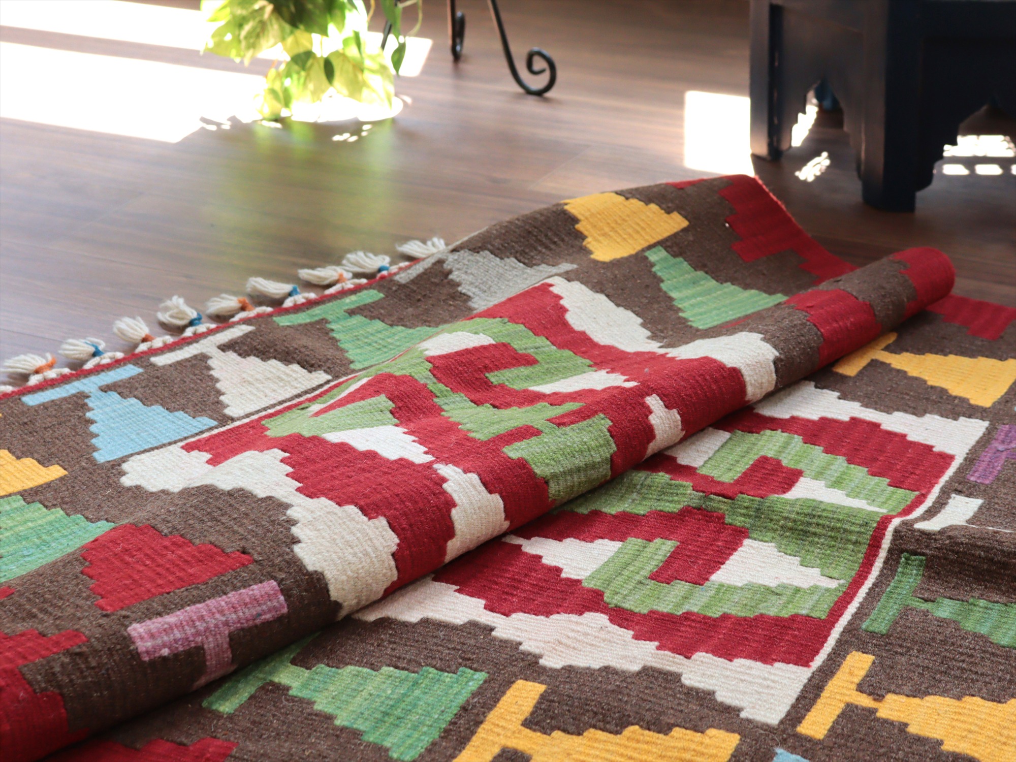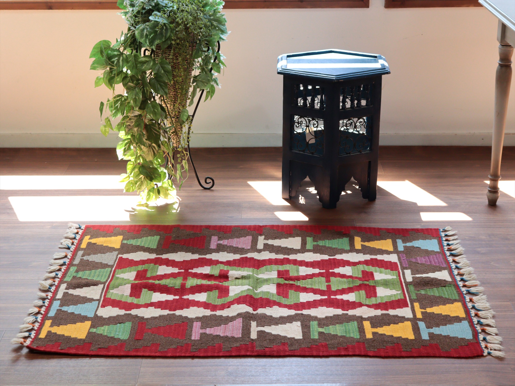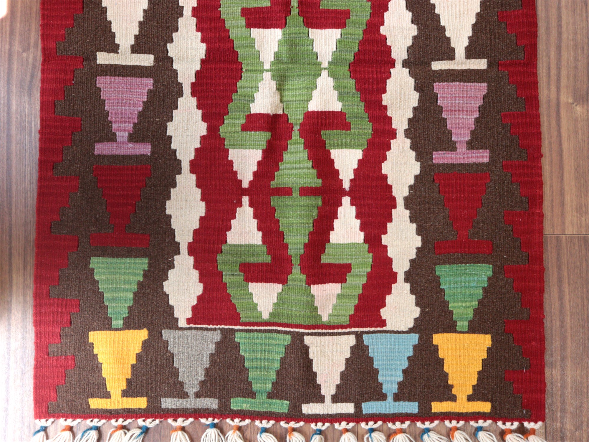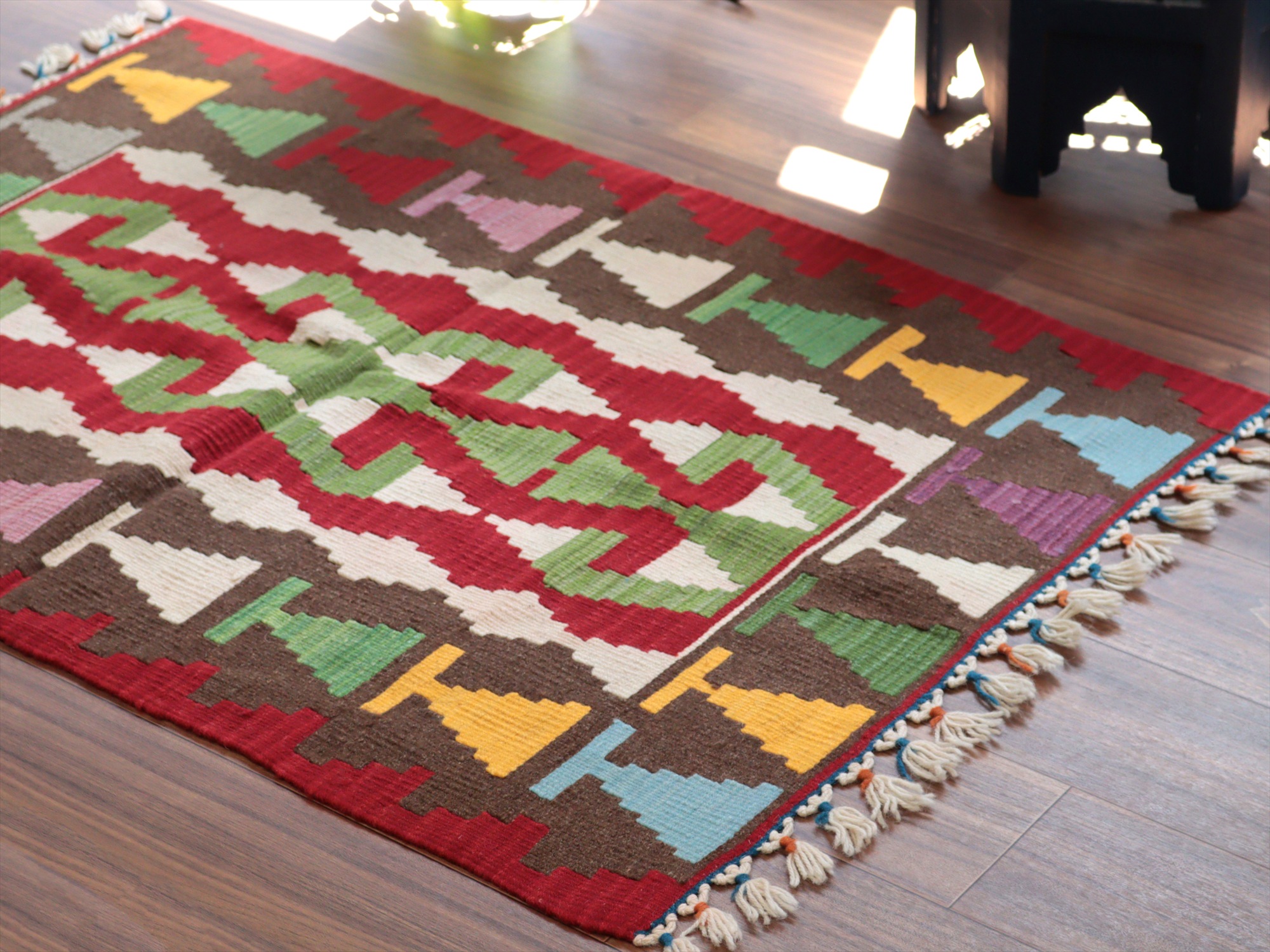 - カイセリ産手織りキリム116×85cm レッド&ブラウン トルコの手織りラグ