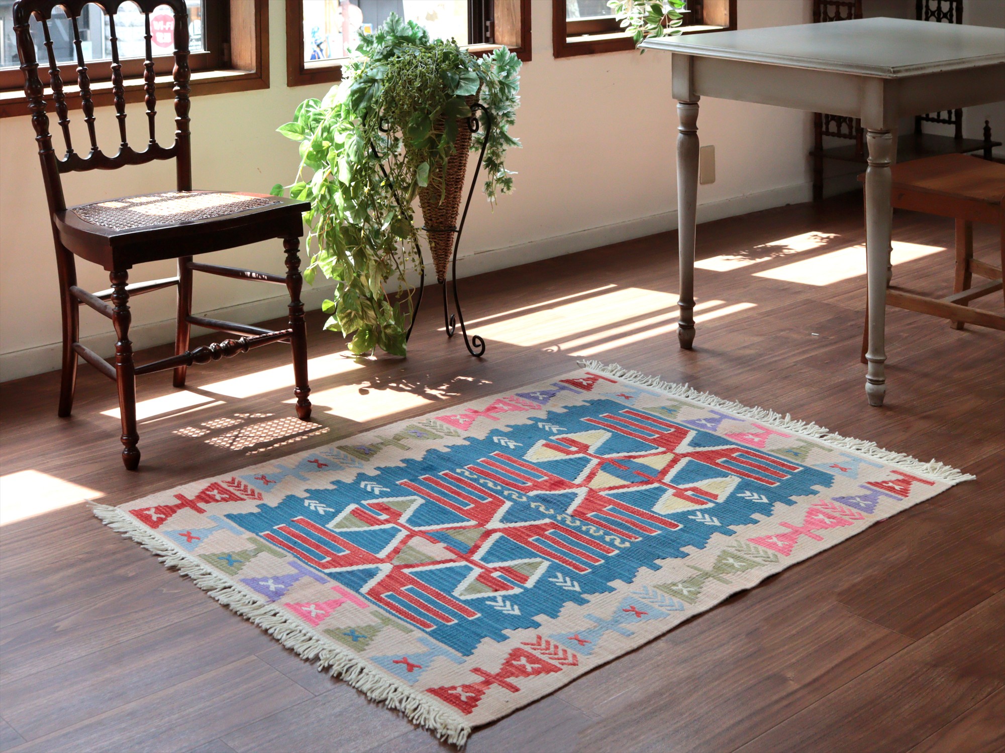 トルコキリムらしい伝統的なスタイルで織られているカイセリ産のキリムです。カイセリ地方は、トルコの中央部、カッパドキアに近く、古い時代から多くの諸品が集まり、現在でも絨毯やキリム産業の中心となっています。工業製品にはないあたたかさがあり、我が家のキリムとして愛着の持てる一枚になってくれます。
