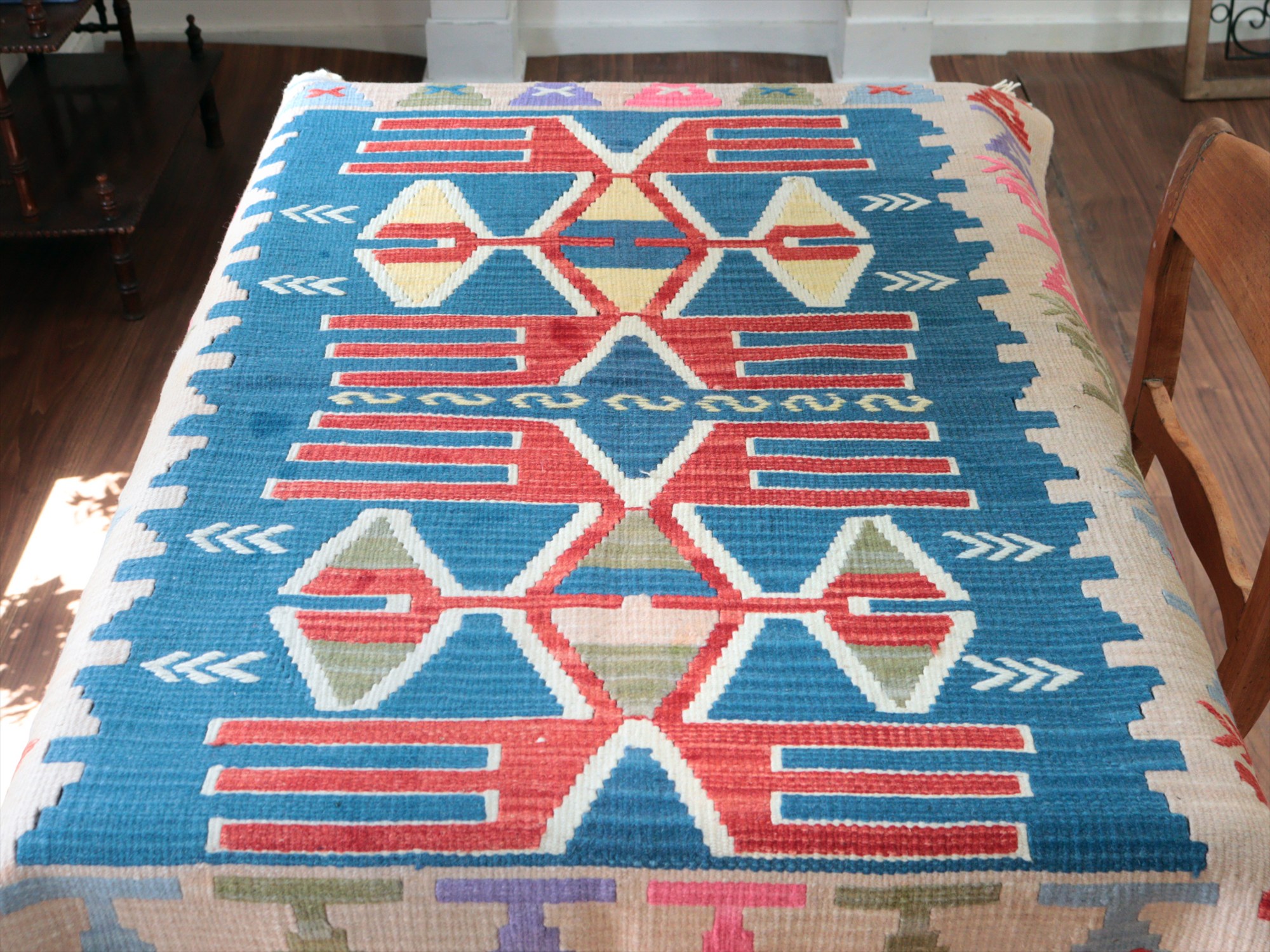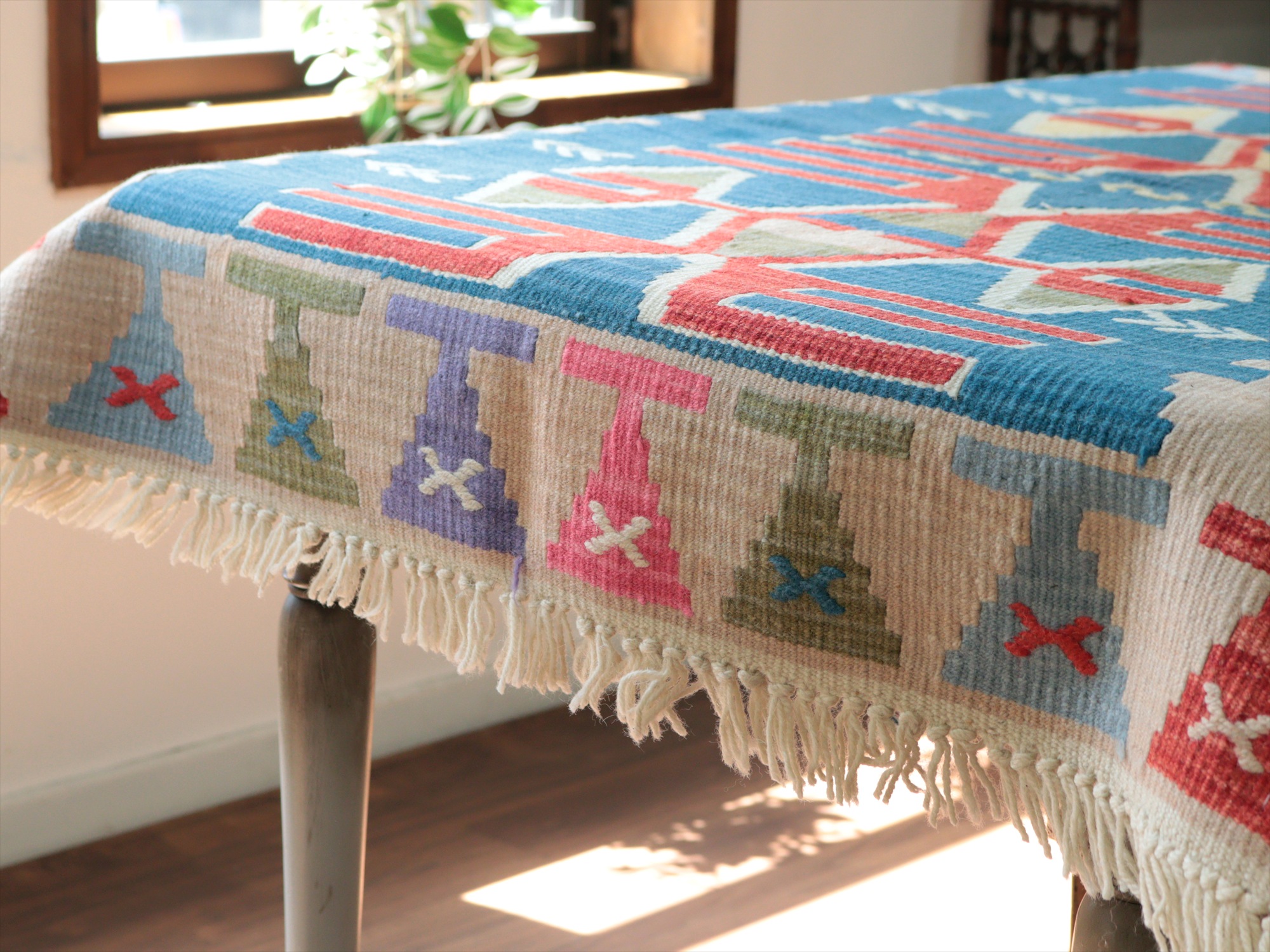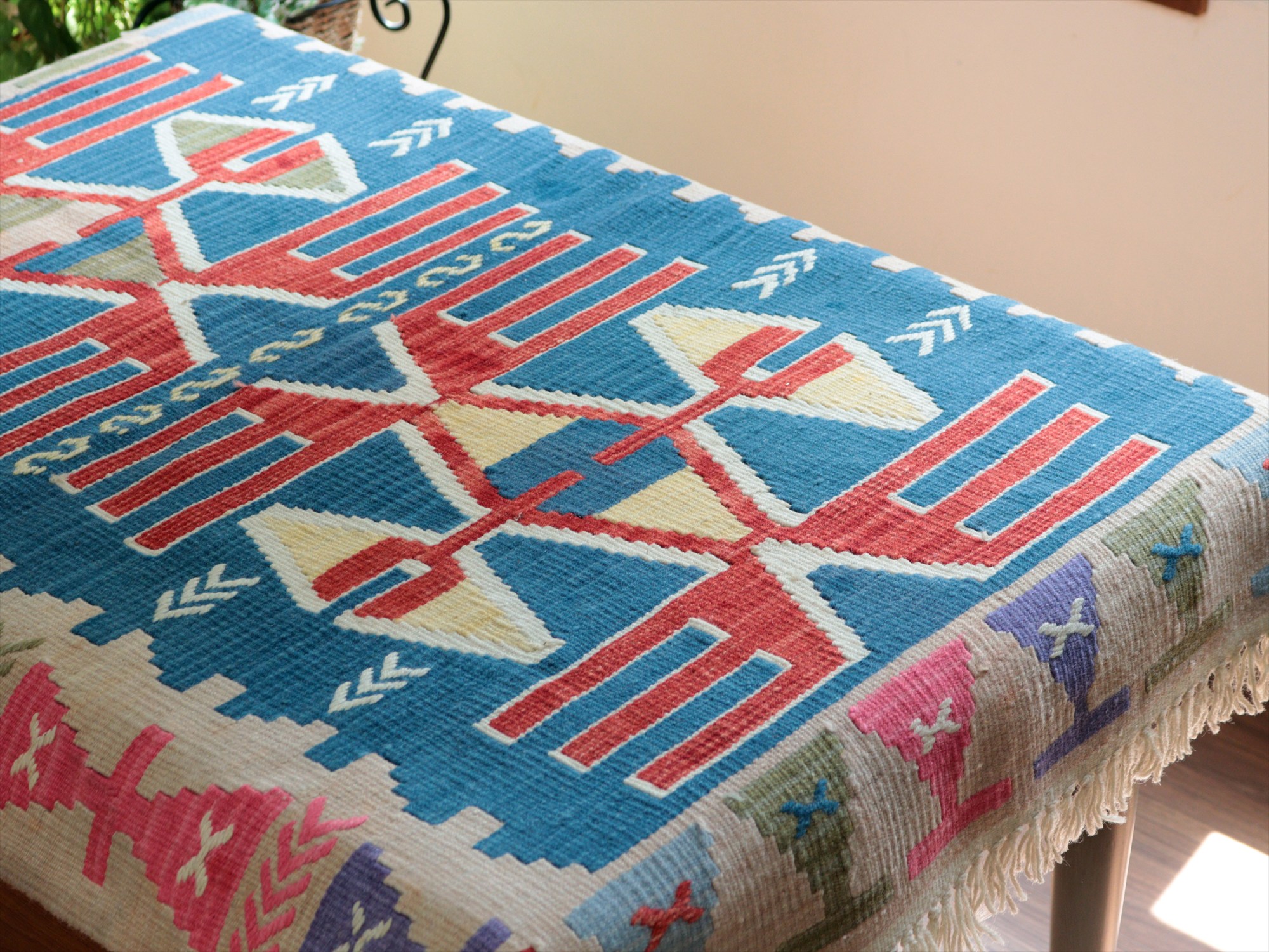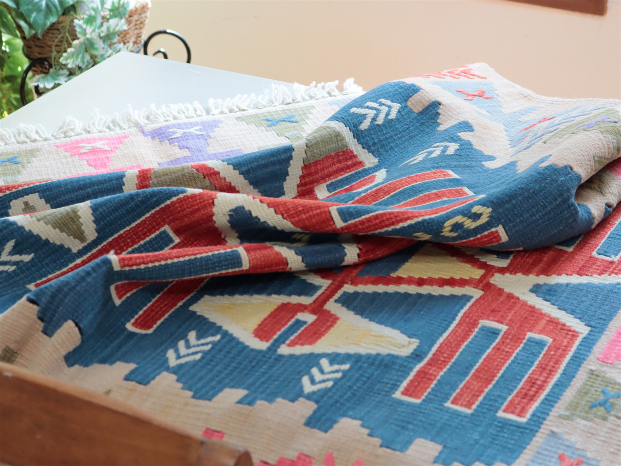 織り地がしなやかでやわらかいのがカイセリキリムの特徴です。やや厚みがあり、やさしい肌触り。色の切り替え部分には、キリムの織りの特徴で、縦に隙間が開いています(スリットと呼んでいます)。