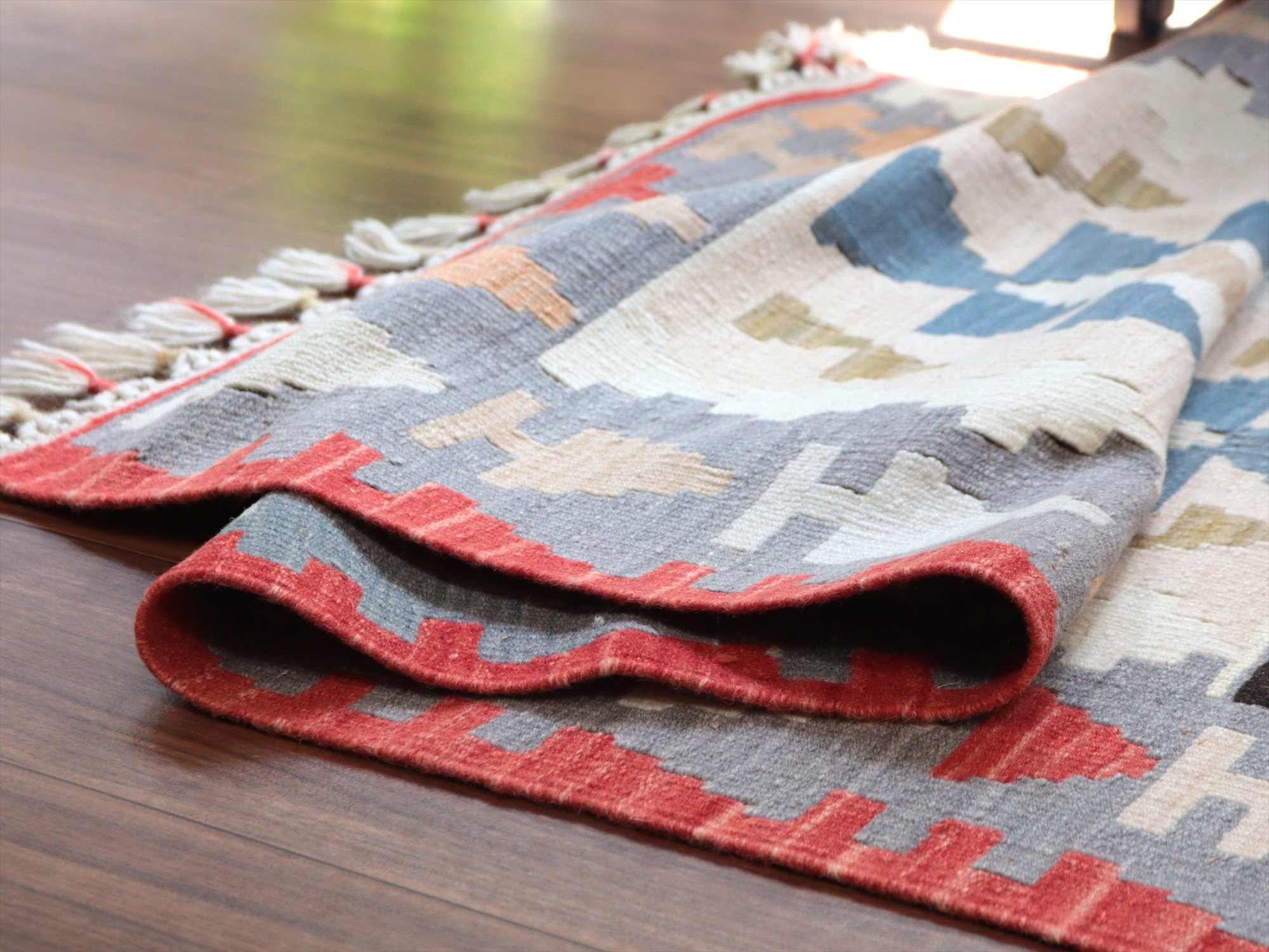 織り地がしなやかでやわらかいのがカイセリキリムの特徴です。やや厚みがあり、やさしい肌触り。色の切り替え部分には、キリムの織りの特徴で、縦に隙間が開いています(スリットと呼んでいます)。
