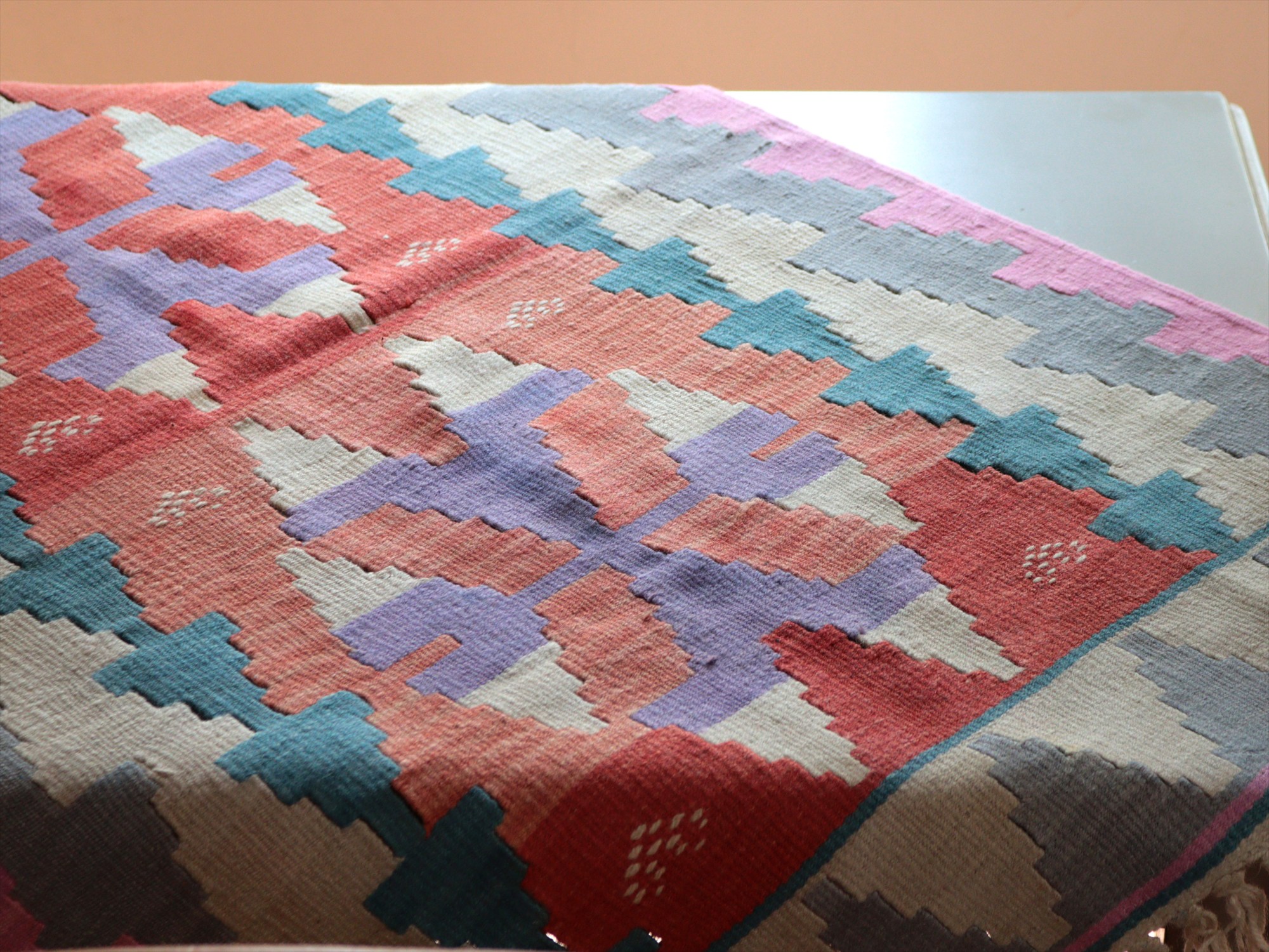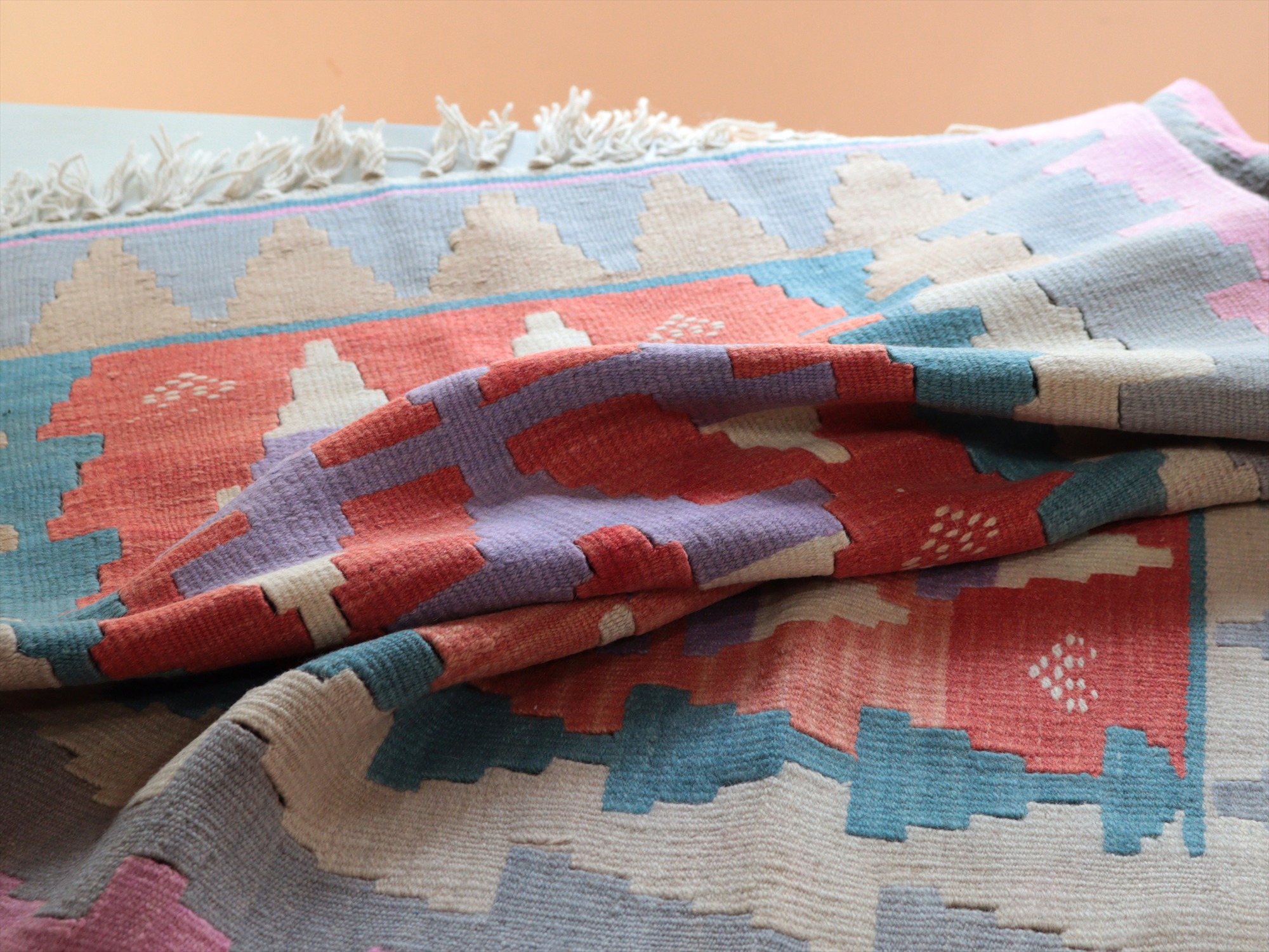 織り地がしなやかでやわらかいのがカイセリキリムの特徴です。やや厚みがあり、やさしい肌触り。色の切り替え部分には、キリムの織りの特徴で、縦に隙間が開いています(スリットと呼んでいます)。