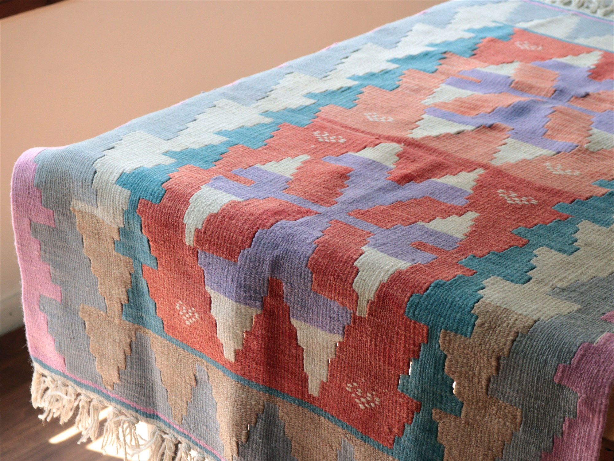 ファンシーな色使いで織られたカイセリキリム。長い間使われて色褪せた雰囲気に仕上げられています。