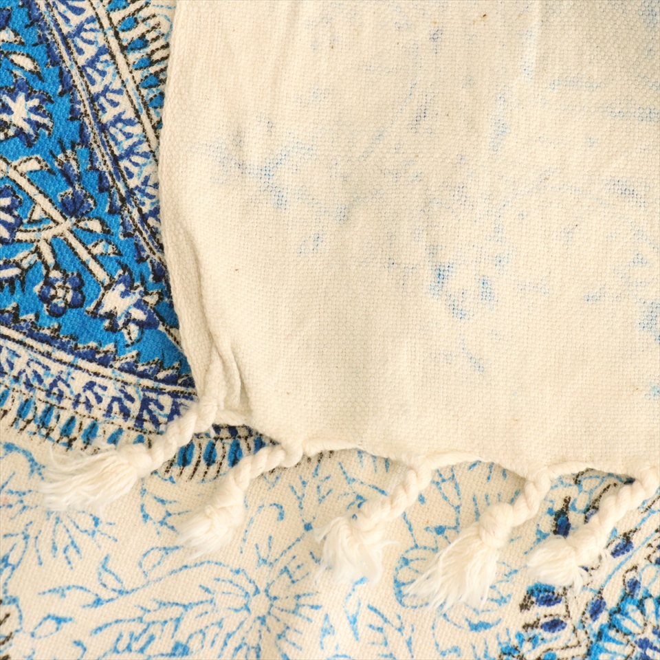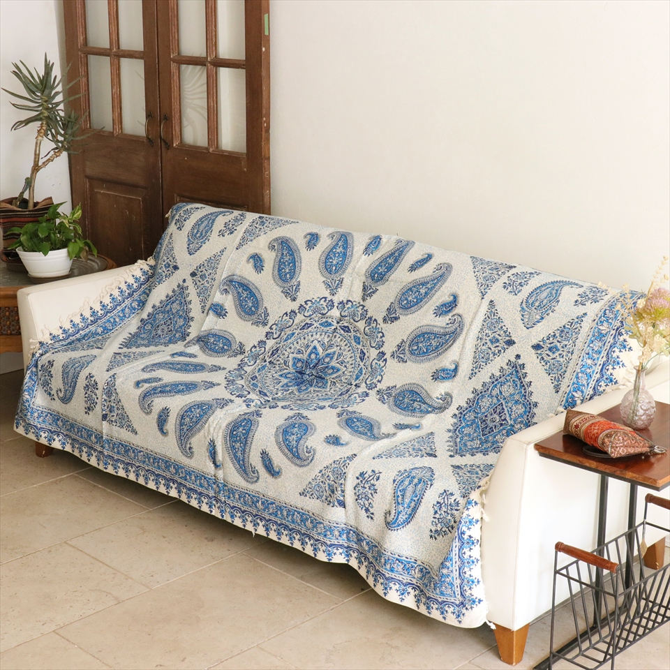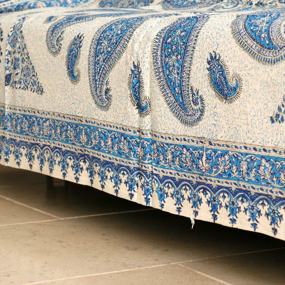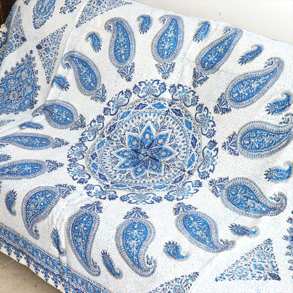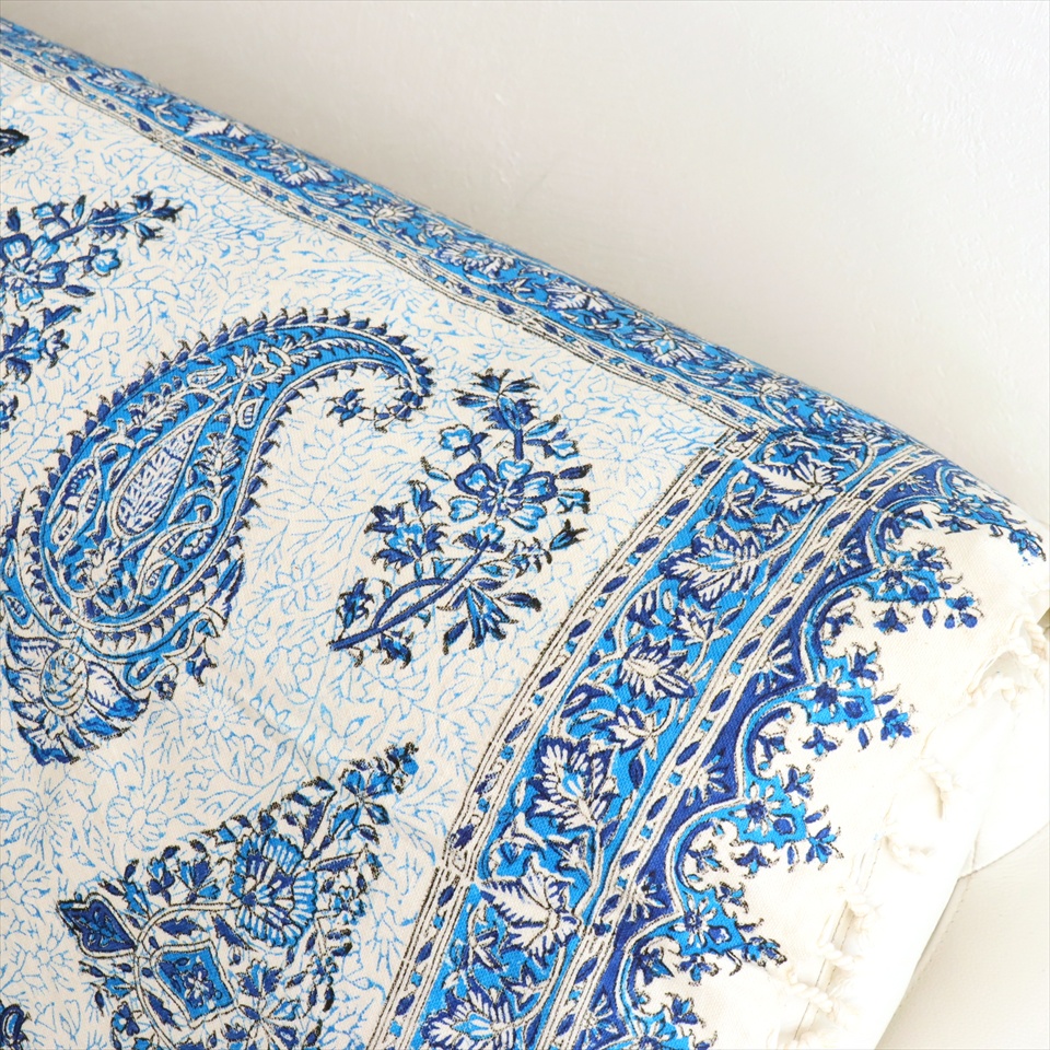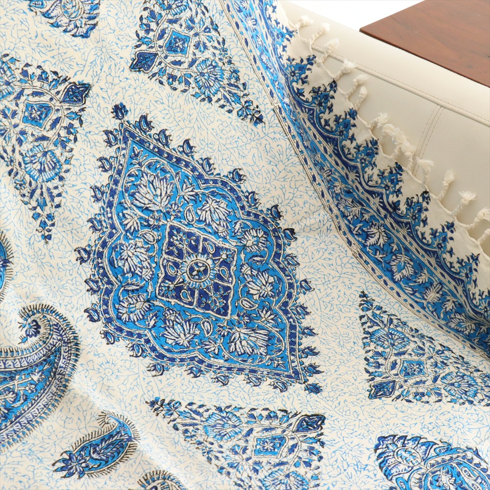 Key:コットン 染色 ブロックプリント 木版 捺染 伝統工芸 ペルシャブルー ペイズリー フリークロス マルチカバー ベッドスプレッド ベッドカバー ソファカバー カーテン タペストリー ファブリック インテリアファブリック クラフト インテリア ペルシャ ペルセポリス イラン 中東 シルクロード アジアン エスニック 200cmサイズ