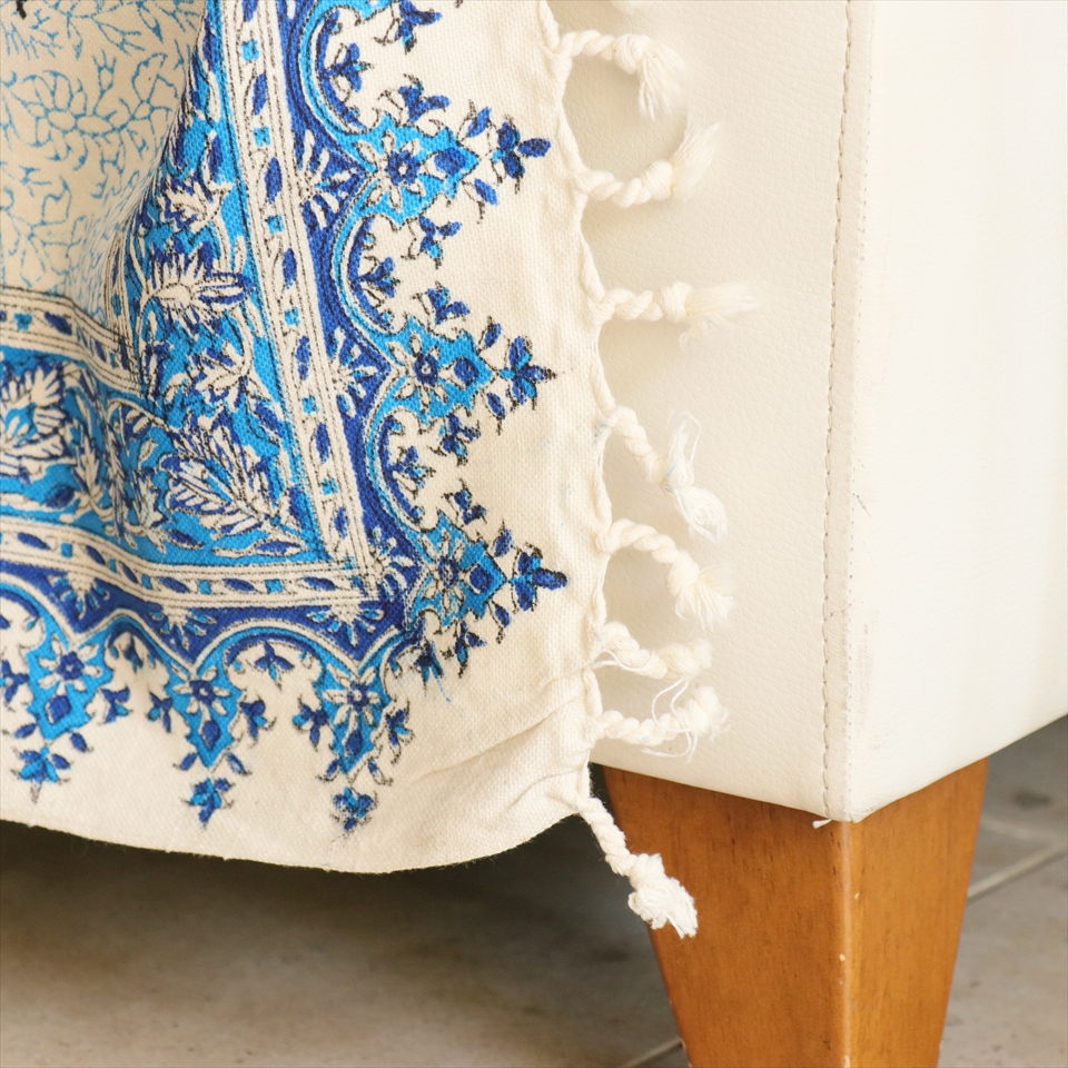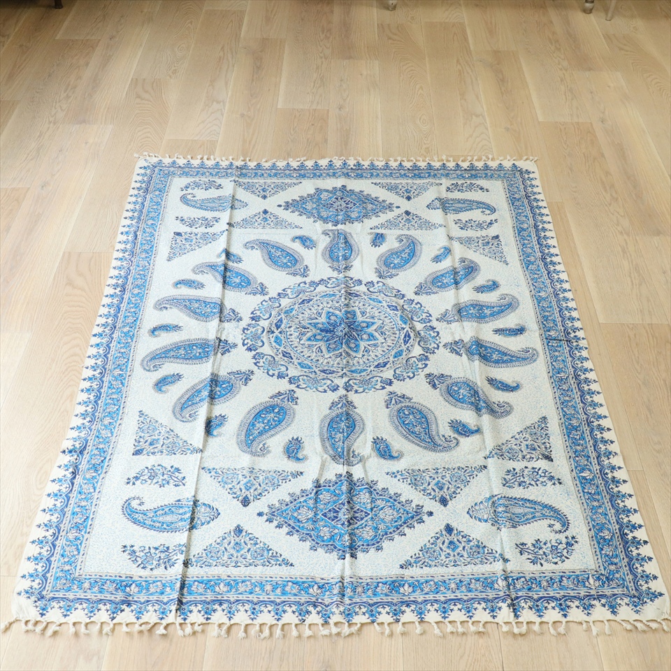 ペルシャ更紗 イラン手染め布 193×127cm ブルー系 ペイズリー柄 テーブルクロス ソファカバー