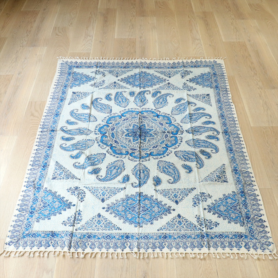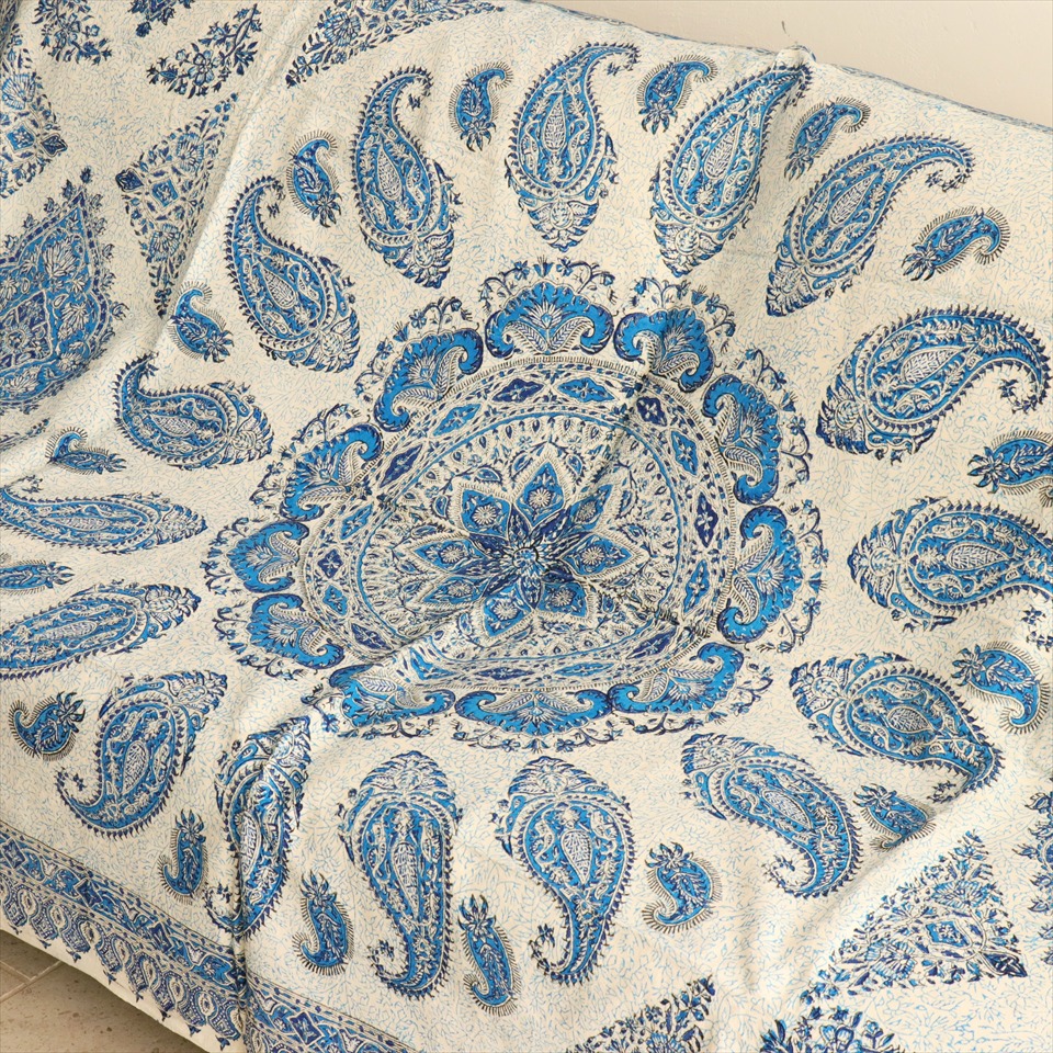 ペルシャ更紗 イラン手染め布 192×126cm ブルー系 ペイズリー柄 テーブルクロス ソファカバー