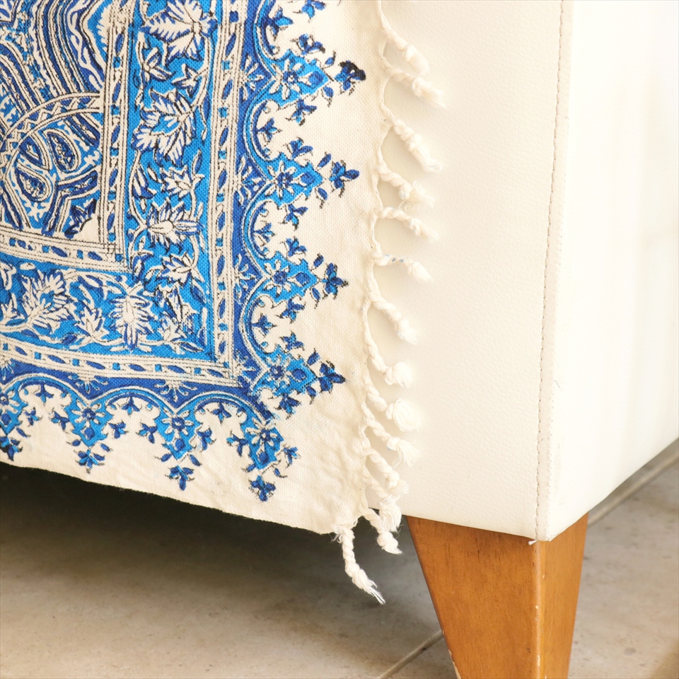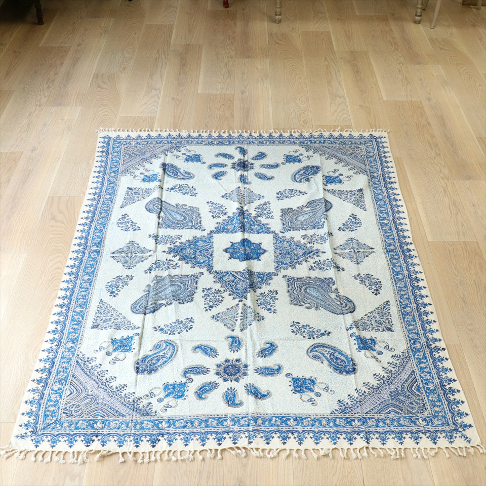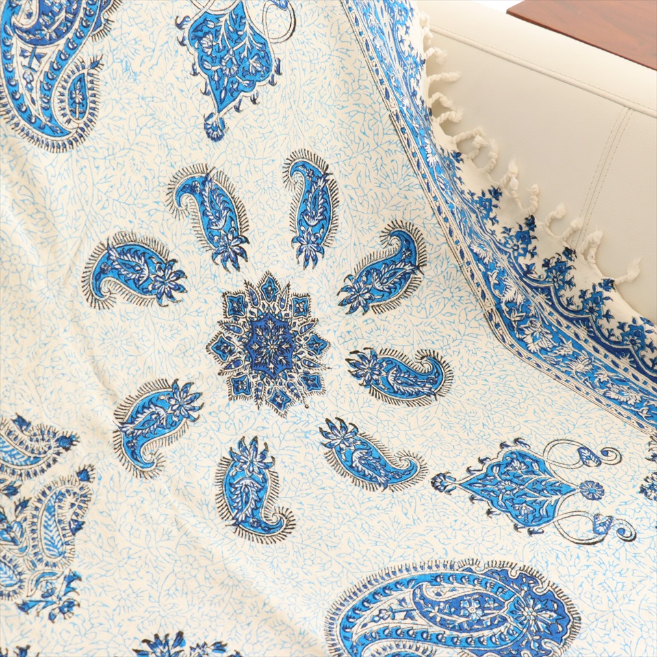 ペルシャ更紗 イラン手染め布 190×130cm ブルー系 ペイズリー柄 テーブルクロス ソファカバー