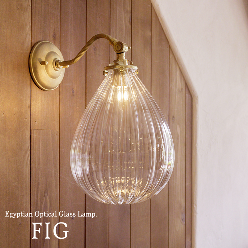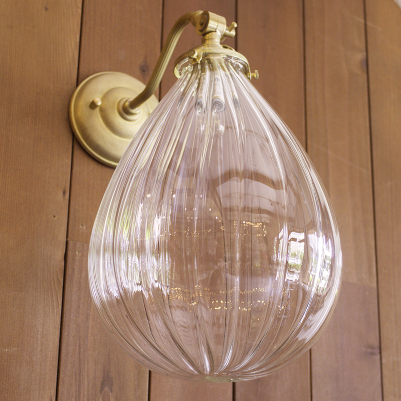 アンティークな雰囲気が漂う真鍮製ブラケットと無花果のようなユニークな形をしたガラスシェードを使った壁掛けランプ。