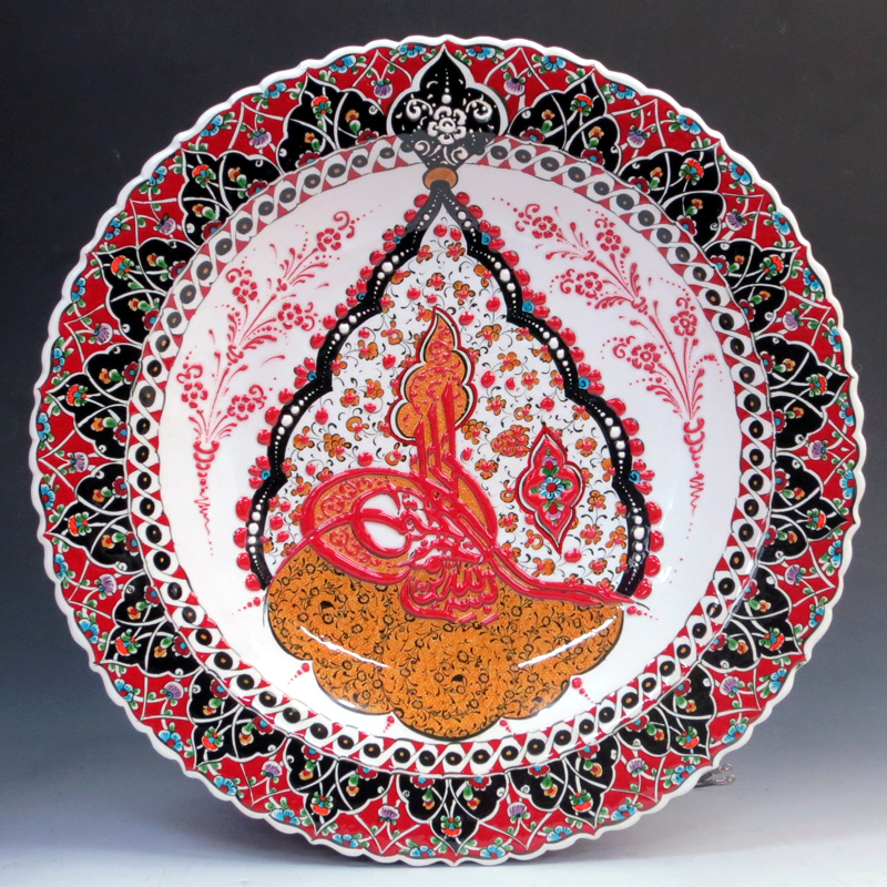 このプレートは、随所に立体的に盛り上がった釉薬を使い、凹凸のある豪華な絵付けが楽しめます。オスマントルコのスルタンのシンボル、トゥーラの紋章を中央に配したデザインです。