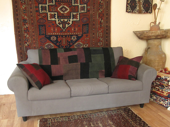 一方、クラシックなアンティーク家具にもよく似合う、オールドキリムのパッチワークも入荷しました!