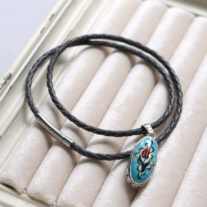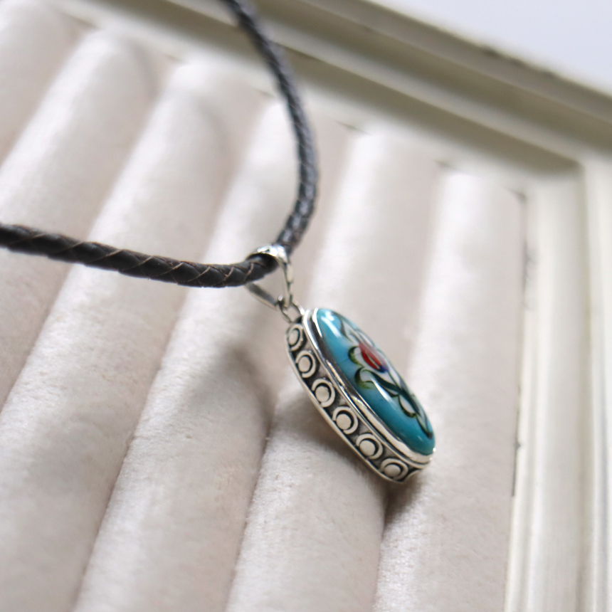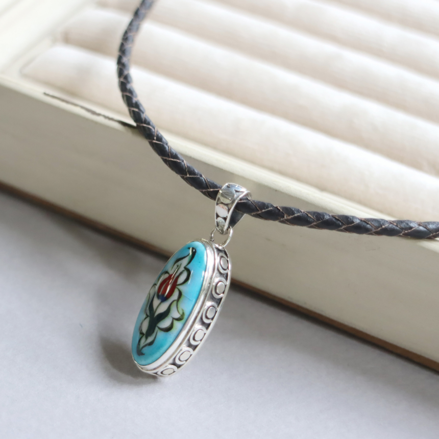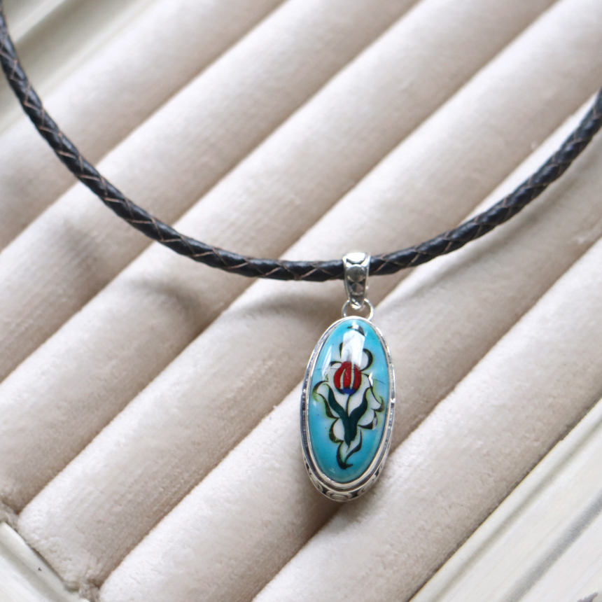 トルコキュターヤは陶芸の街!トルコの職人が、一つひとつ手描きで絵付けしたキュターヤ陶器とシルバー細工のペンダントです。シンプルなデザインで、トルコの国花チューリップが描かれています。