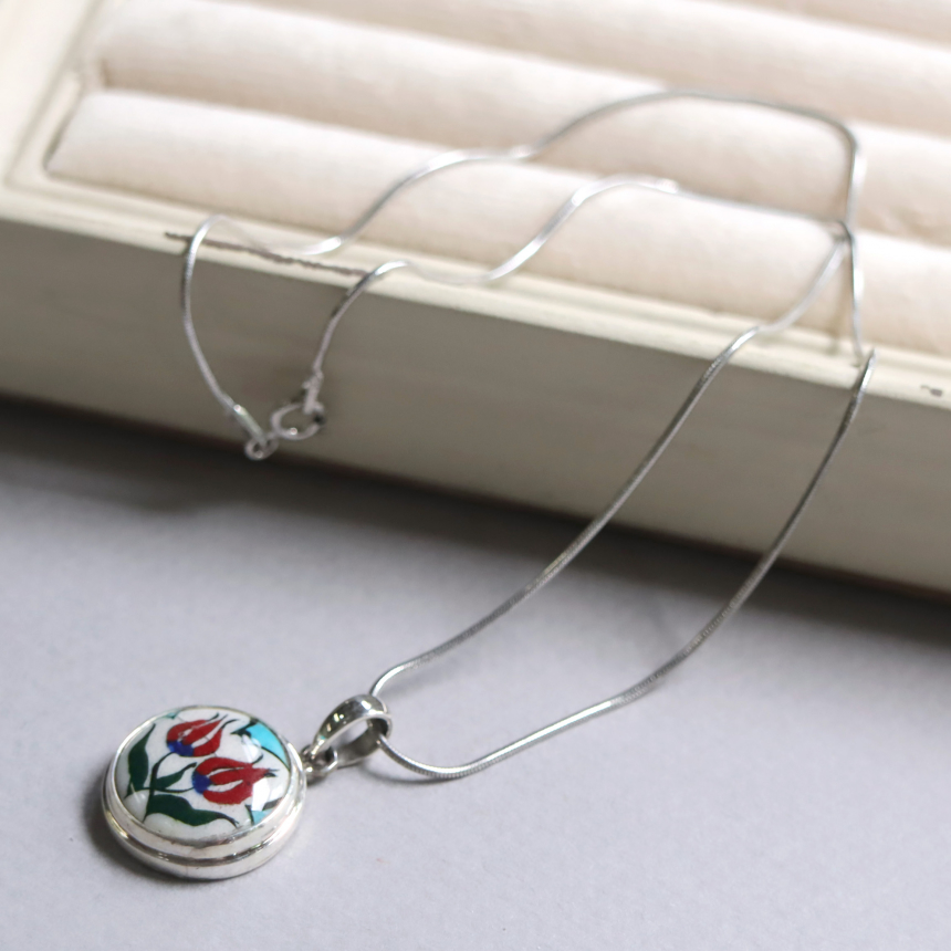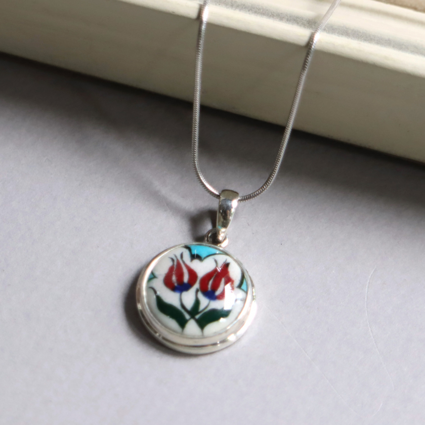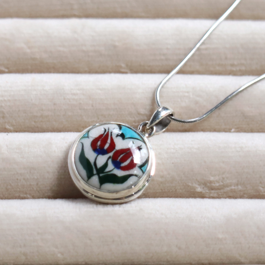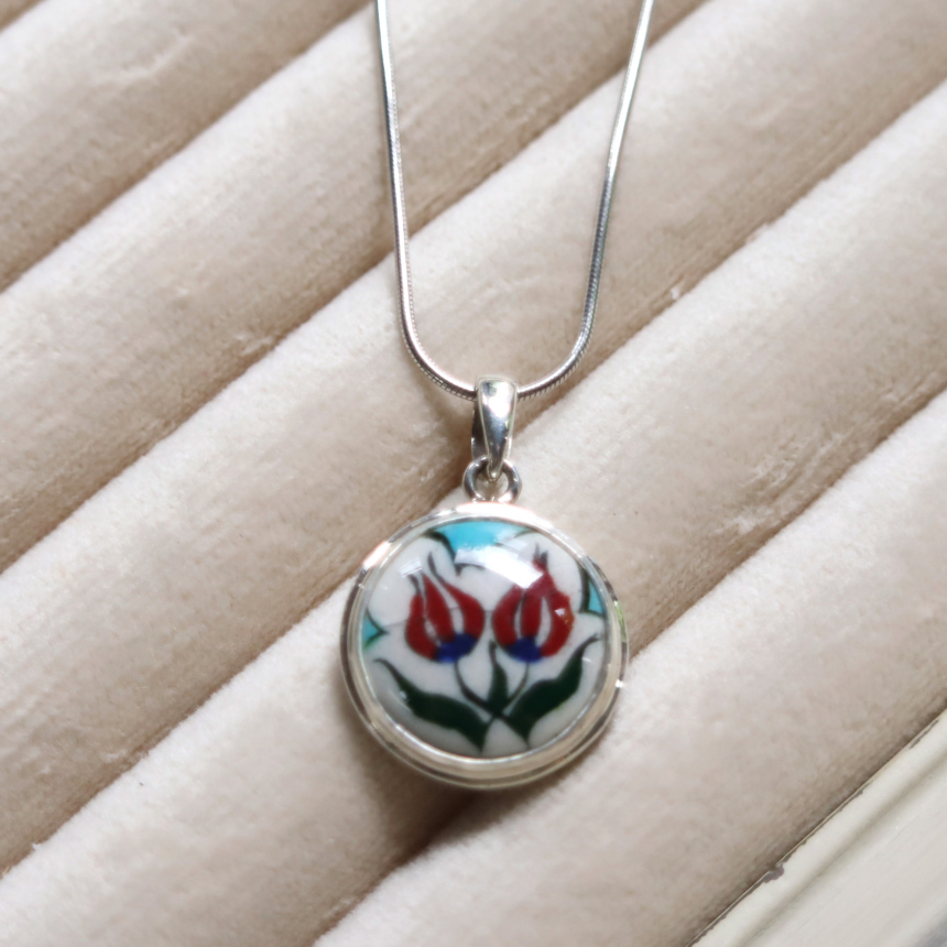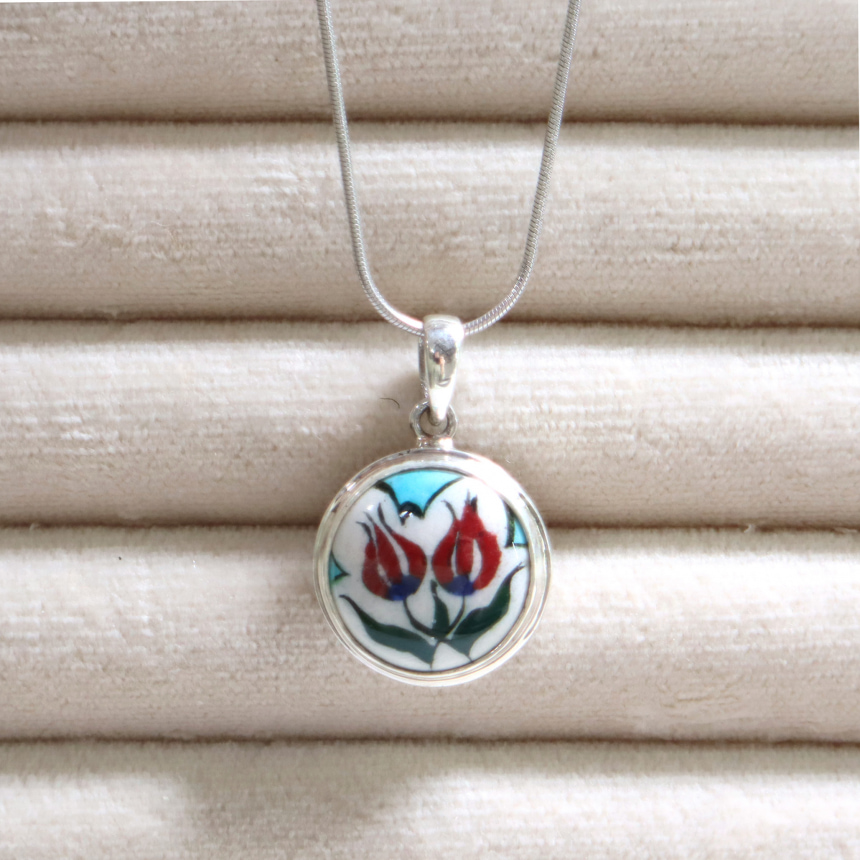 トルコキュターヤは陶芸の街!トルコの職人が、一つひとつ手描きで絵付けしたキュターヤ陶器とシルバー細工のペンダントです。トルコの国花チューリップが描かれています。