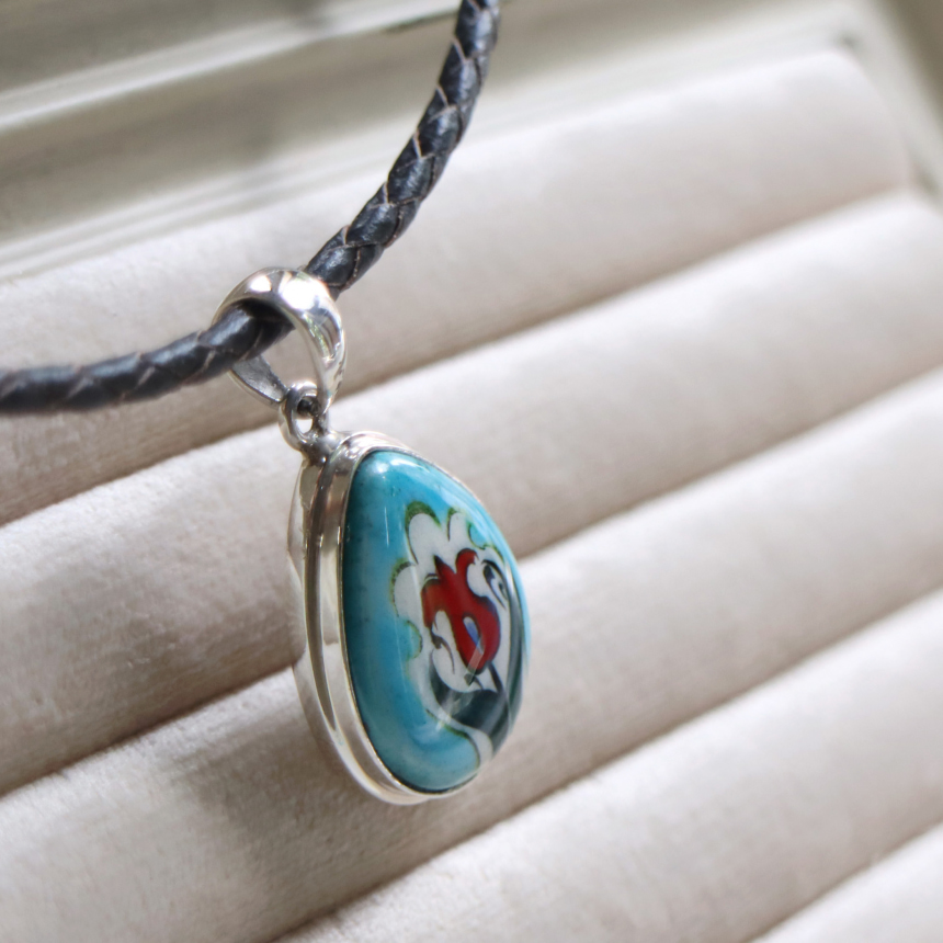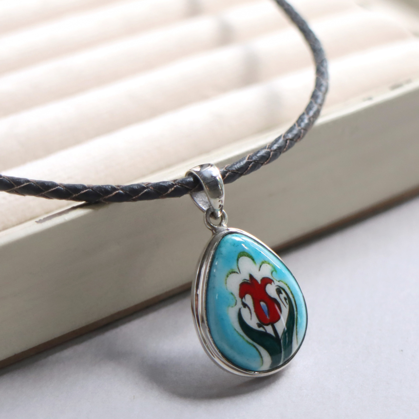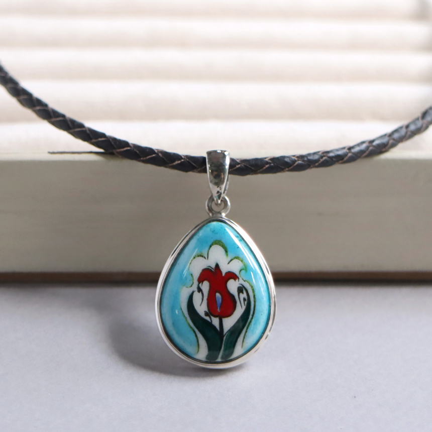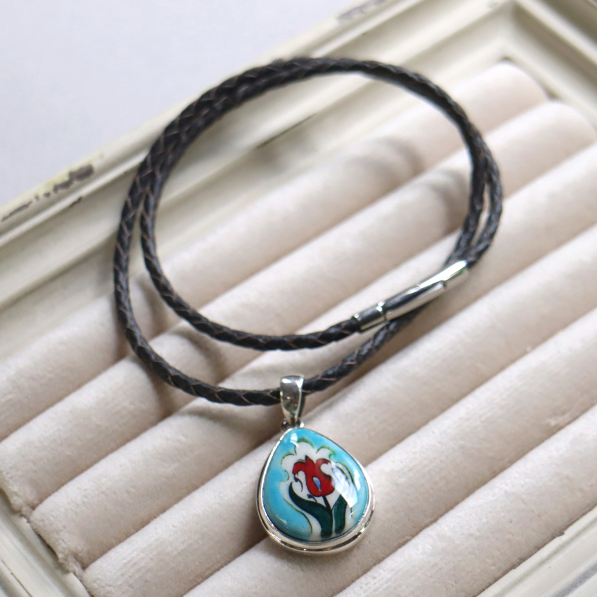 トルコキュターヤは陶芸の街!トルコの職人が、一つひとつ手描きで絵付けしたキュターヤ陶器とシルバー細工のペンダントです。シンプルなデザインで、トルコの国花チューリップが描かれています。