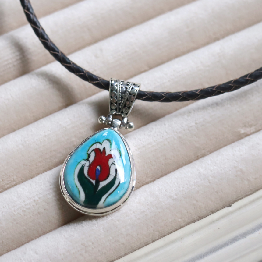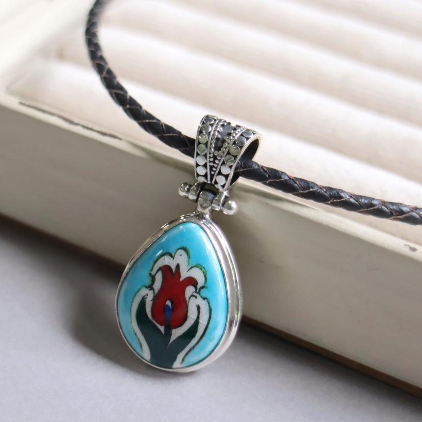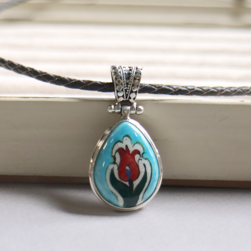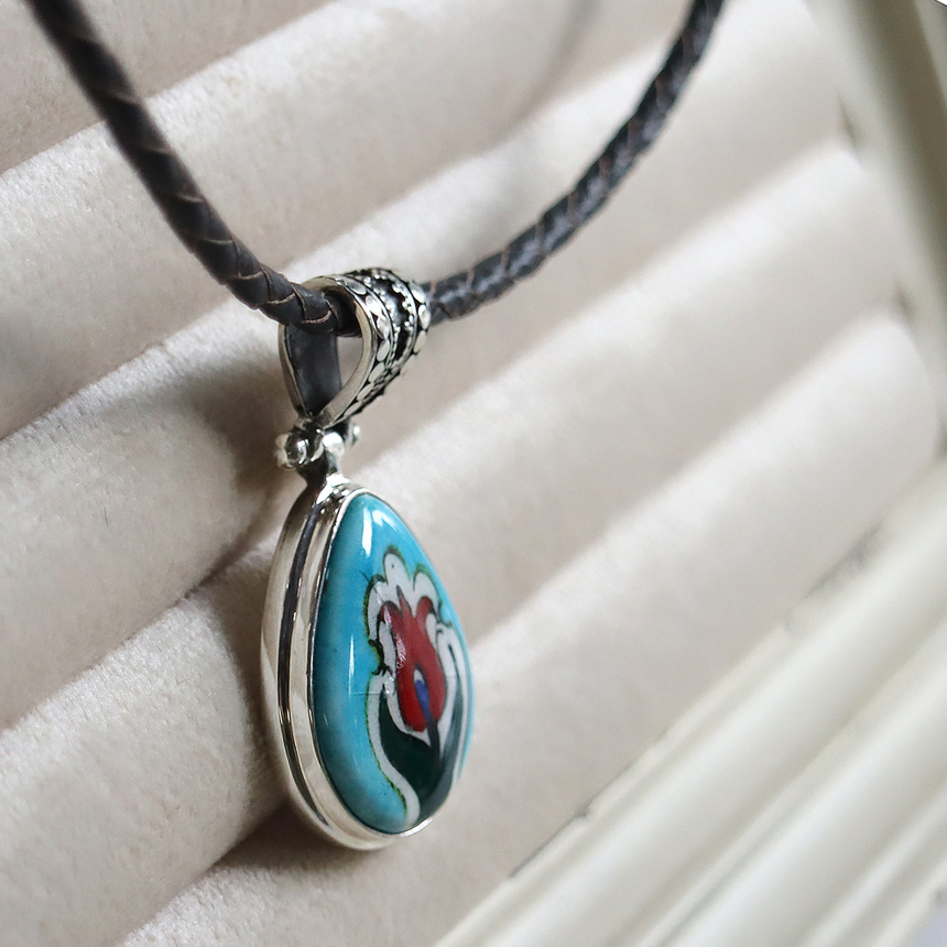 トルコキュターヤは陶芸の街!トルコの職人が、一つひとつ手描きで絵付けしたキュターヤ陶器とシルバー細工のペンダントです。シルバー細工も凝ったデザインで、本体とバチカン部分は蝶番になっていて稼働します。トルコの国花チューリップが描かれています。