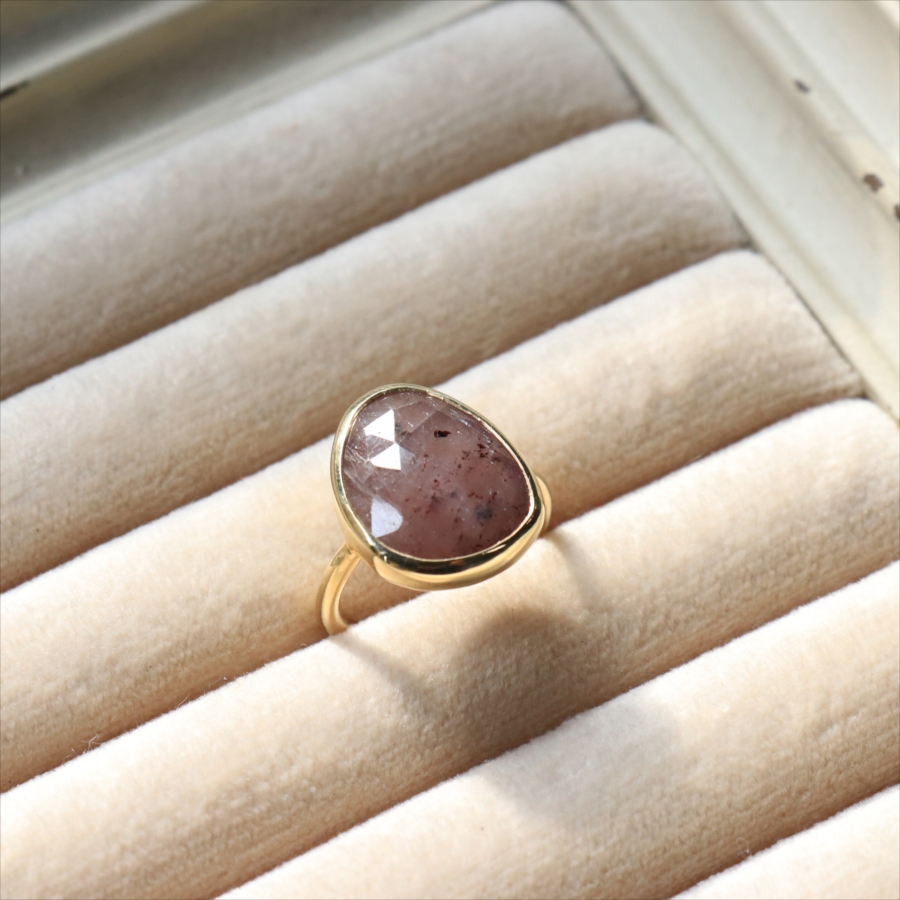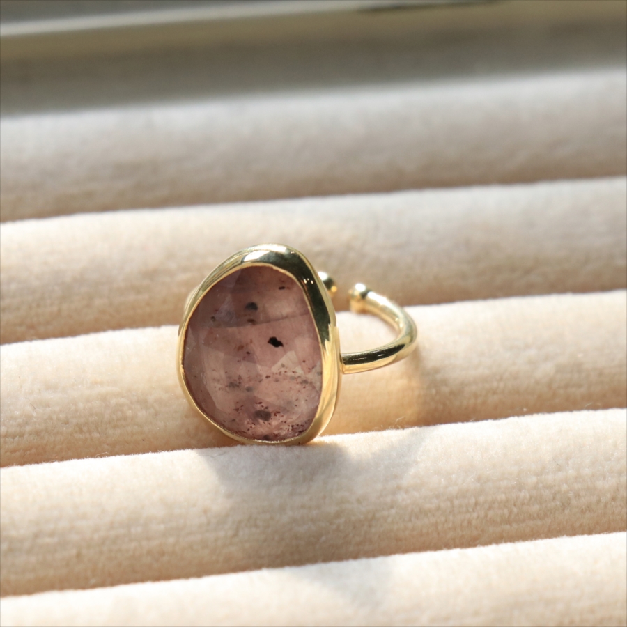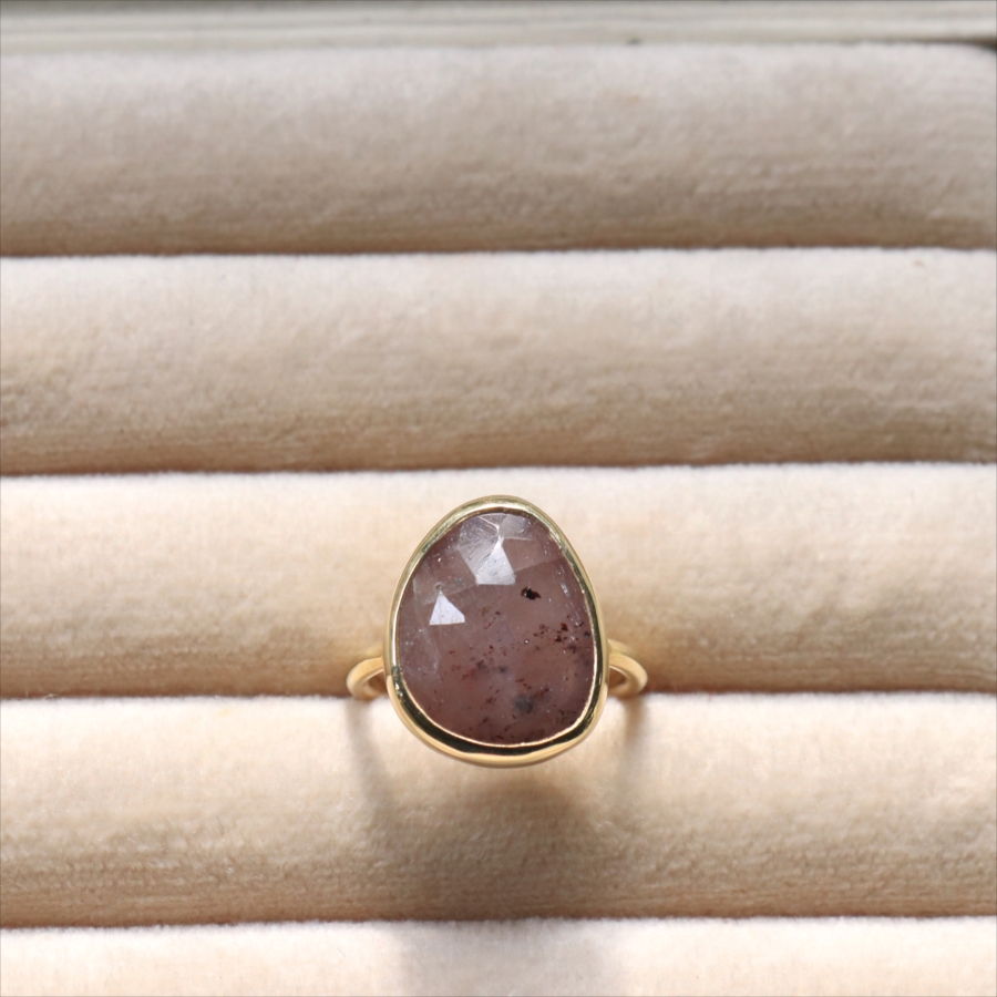 大粒の淡いグレーがかったラズベリーレッドの輝きが美しいサファイアリング。絶妙なニュアンスカラーが肌なじみ良く上品にみせてくれます。裏面は光を透す仕様になっています。