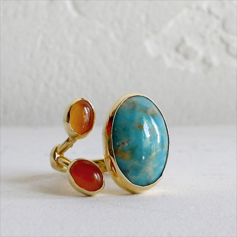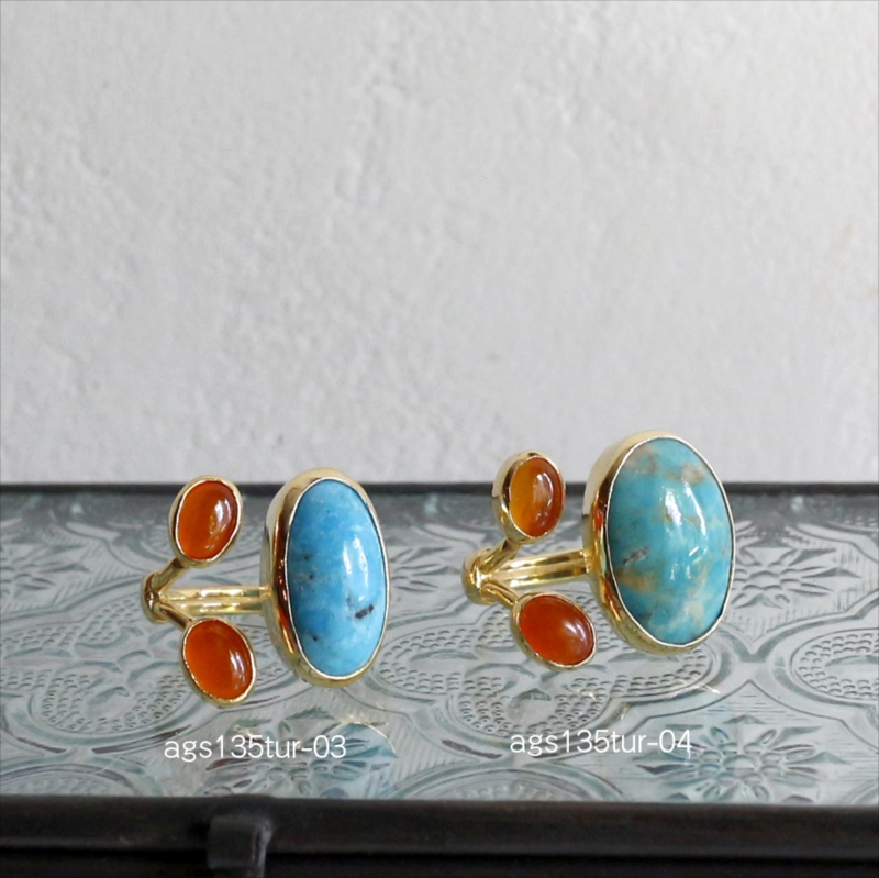 原石の雰囲気をそのままに大粒のマットなターコイズと、かわいらしいサイズのカボションカットのコロンとしたオレンジブラウンが美しいカーネリアンが二つ寄り添うようについたデザインのリングです。それぞれの石は裏面が抜けているので、光を透す仕様になっています。※ターコイズ1.7×1.2cm