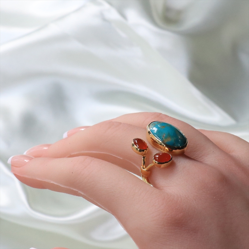 - ターコイズ×カーネリアン シルバーリング 誕生石 18KGF 天然石 三つのストーン オーバルリング トルコジュエリー