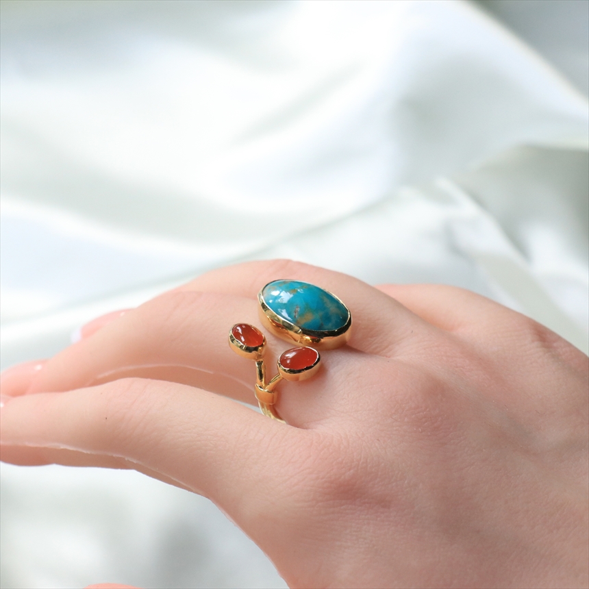 ターコイズ×カーネリアン シルバーリング 誕生石 18KGF 天然石 三つのストーン オーバルリング トルコジュエリー