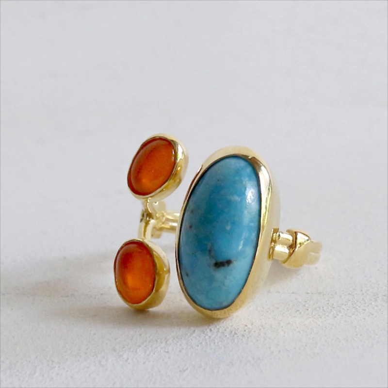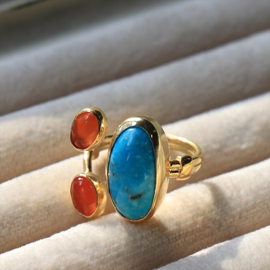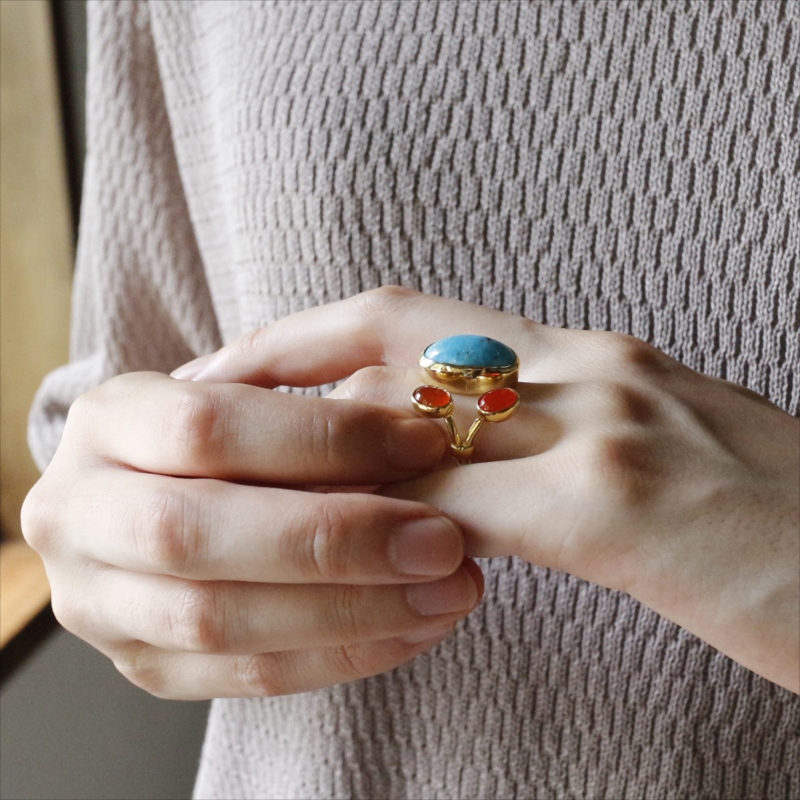 原石の雰囲気をそのままに大粒のマットなターコイズと、かわいらしいサイズのカボションカットのコロンとしたオレンジブラウンが美しいカーネリアンが二つ寄り添うようについたデザインのリングです。それぞれの石は裏面が抜けているので、光を透す仕様になっています。※ターコイズ1.7×0.7cm