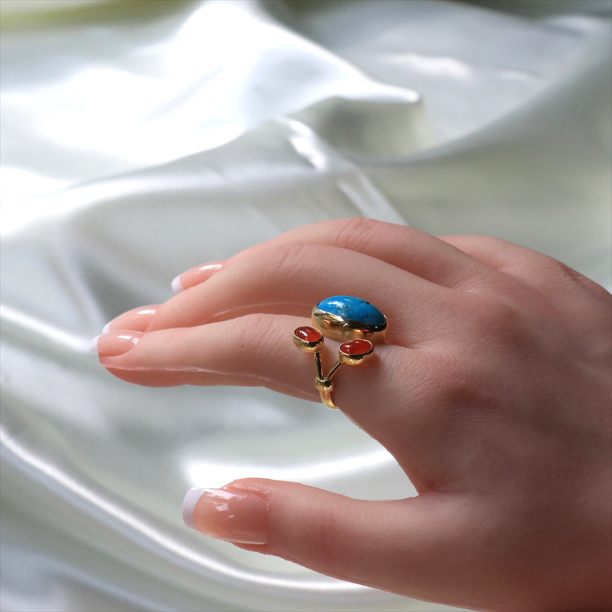 ターコイズ×カーネリアン シルバーリング 誕生石 18KGF 天然石 三つのストーン オーバルリング トルコジュエリー