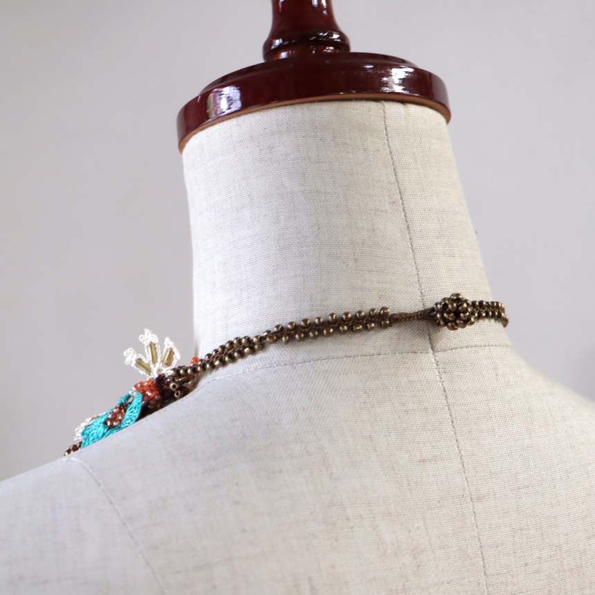 このネックレスは、イスタンブールのデザイナーが、スカーフ飾りをアレンジしたもので、フリルのように見えるひとつひとつがフラワーモチーフです。ビーズとのコンビネーションが美しいハンドメイドアクセサリーです。