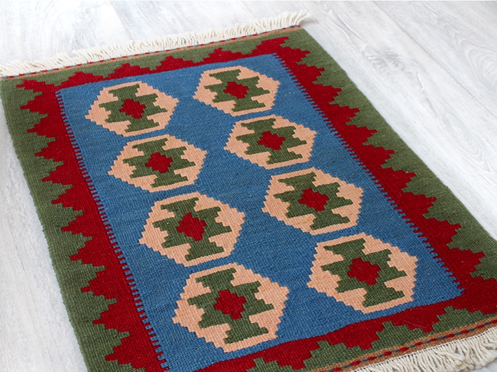 ギャッベを織ることで知られるイラン南部の遊牧民・カシュカイ族の織ったカラフルな幾何学模様がユニークな手織りキリムです。テーブルやサイドボードのうえに敷いたり、もちろん玄関マットとしても個性的なお部屋のアクセントになってくれます。