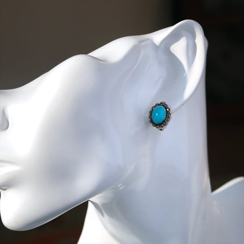 カボションカットのコロンとした立体的なトルコ石の周りにきらめくマルカジットがあしらわれたフラワーモチーフのピアス。マルカジットはマーカサイトともよばれ、18世紀にはダイヤモンドの代用品として装飾品などに使われていた鉱物で、角度によってグレー交じりの淡い黄色にきらめきます。主にシルバーと共にセッティングされ、アンティークの雰囲気が魅力です。※横幅1㎝