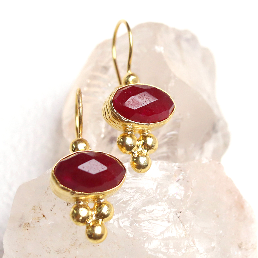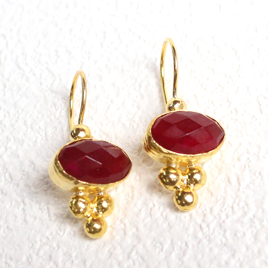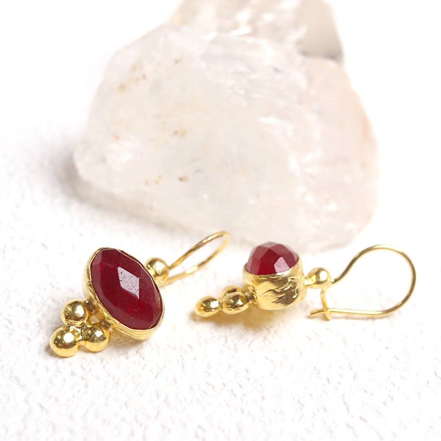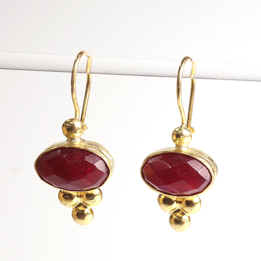 深いレッドが美しい翡翠(ジェイド)の楕円形モチーフピアス。ローズカットが施された石に光が反射し輝きます。耳元のワンポイントに。※石1×1.5cm