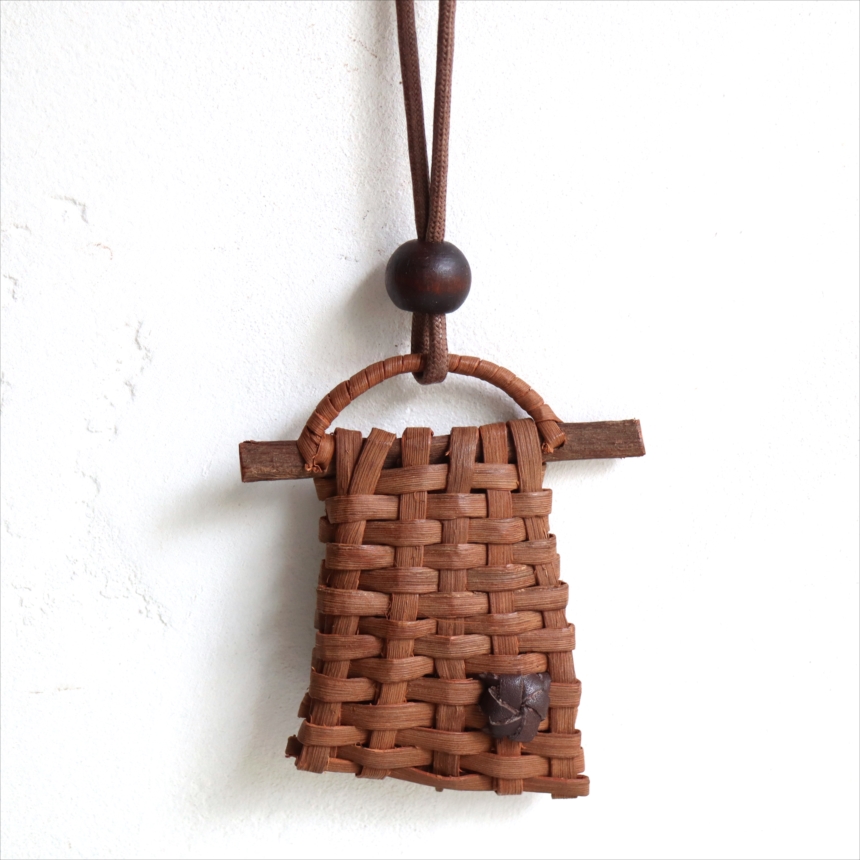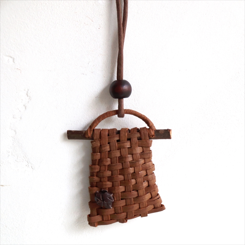 山ぶどうの蔓を編んでつくられた根付です。ユニークな形は、縦と横それぞれ一本ずつのひごを使って編まれていて、職人さんの遊び心が感じられる小さな作品です。