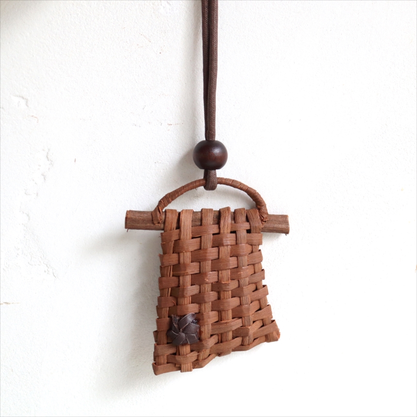 山ぶどうの蔓を編んでつくられた根付です。ユニークな形は、縦と横それぞれ一本ずつのひごを使って編まれていて、職人さんの遊び心が感じられる小さな作品です。