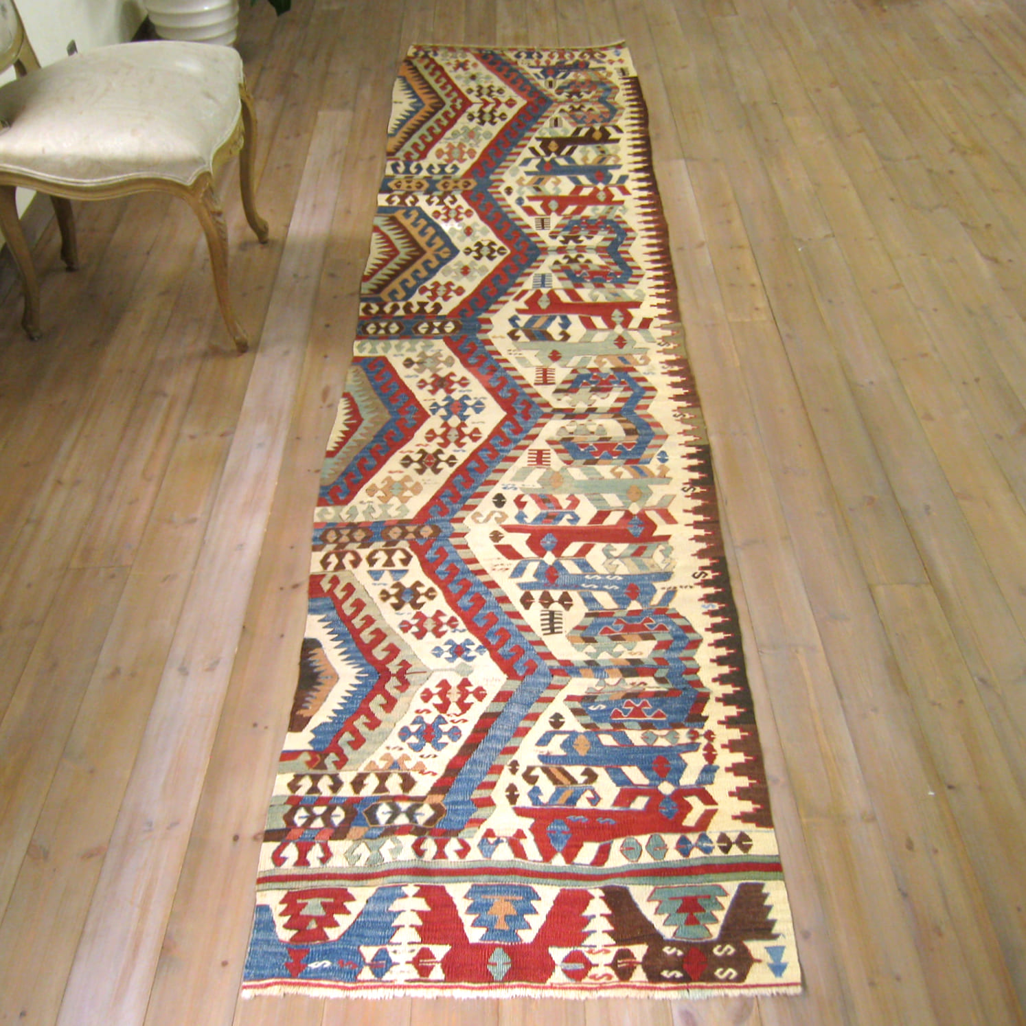 このアイドゥンキリムは20世紀初頭に織られたものと推測され、天然染料の色が今も鮮やかに残っています。片方しかないのは残念ですが、コレクションとしてお持ちになる価値ある一枚です。