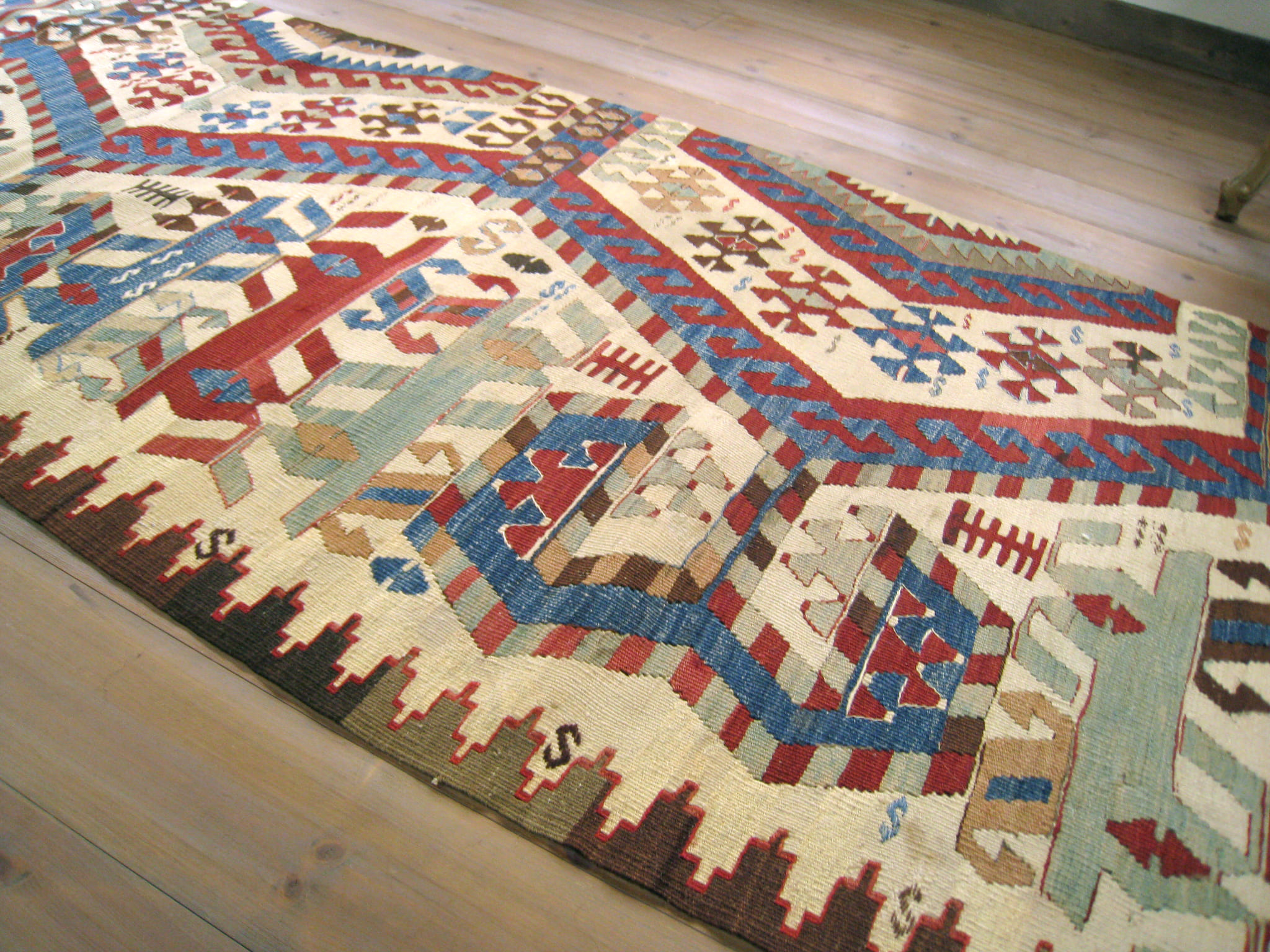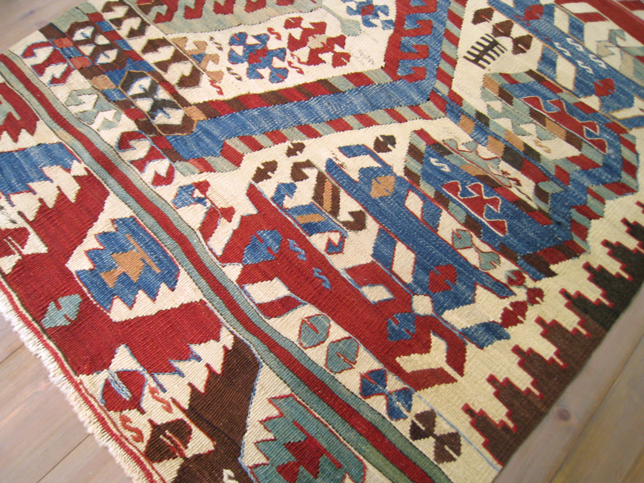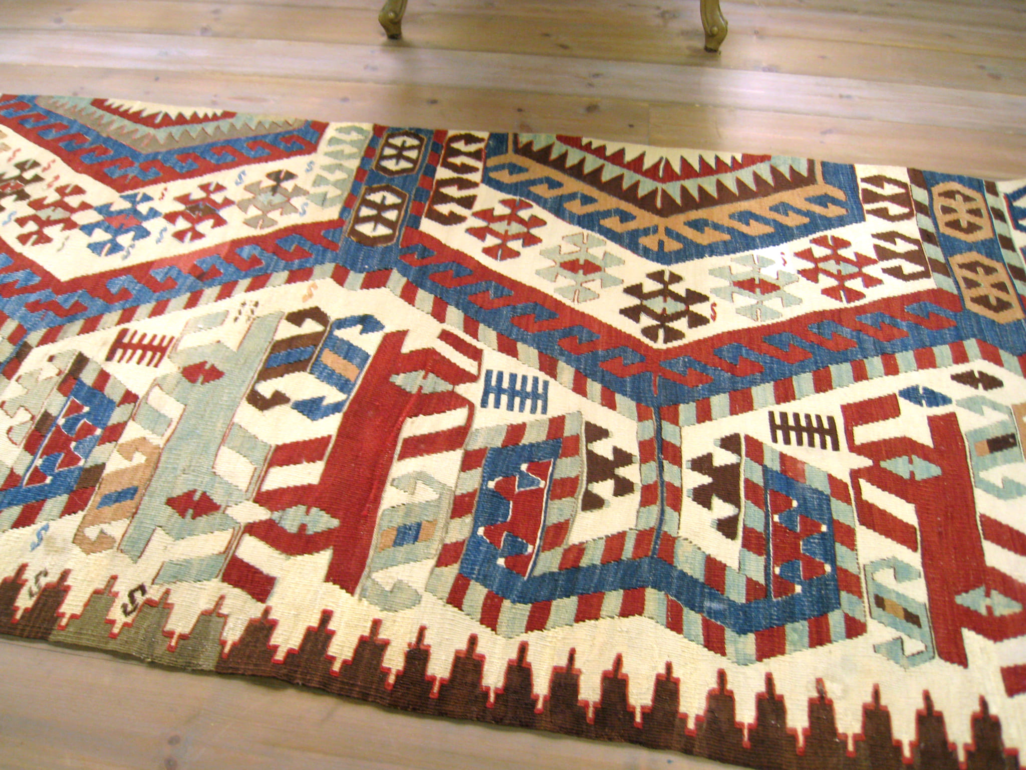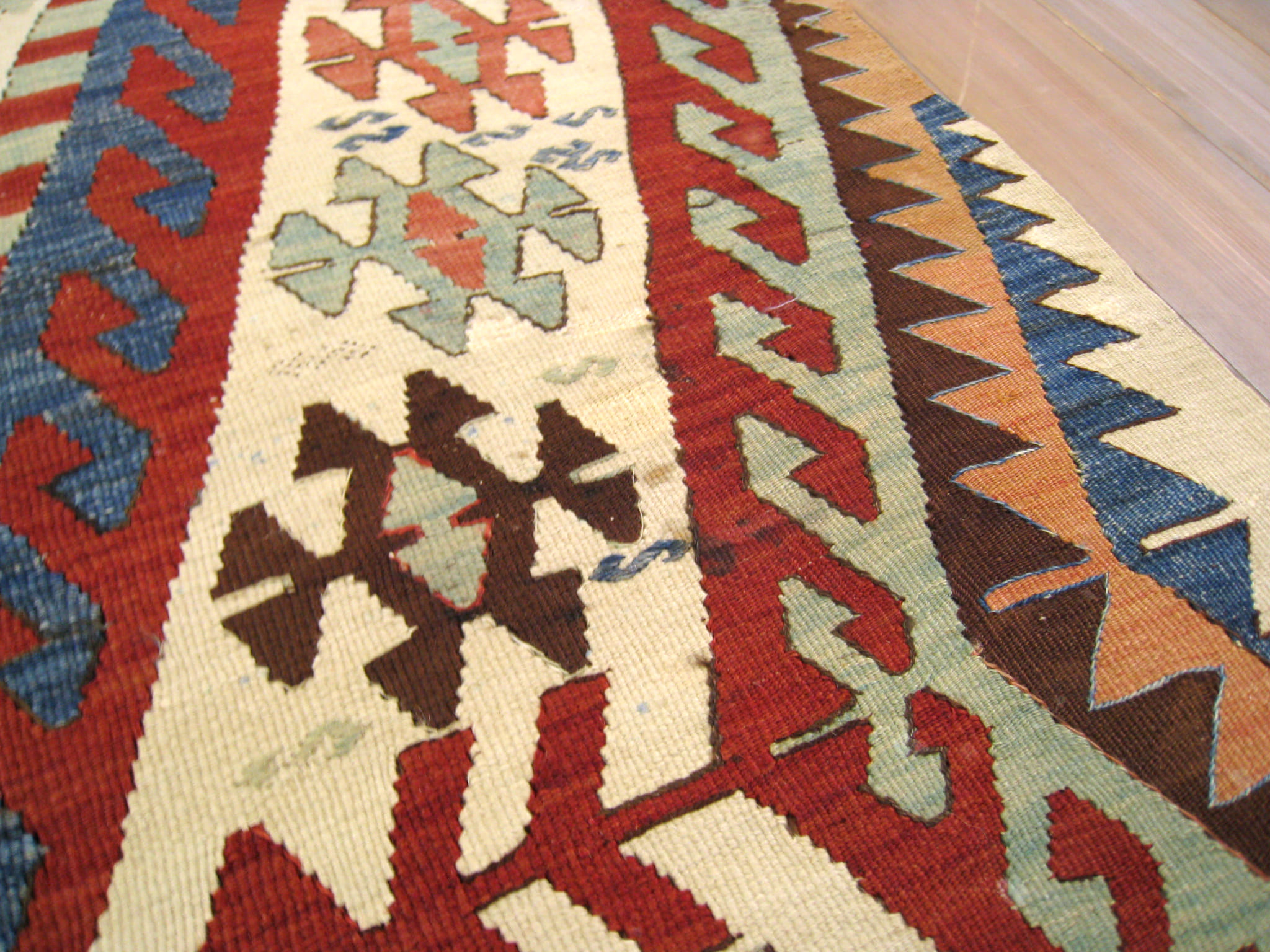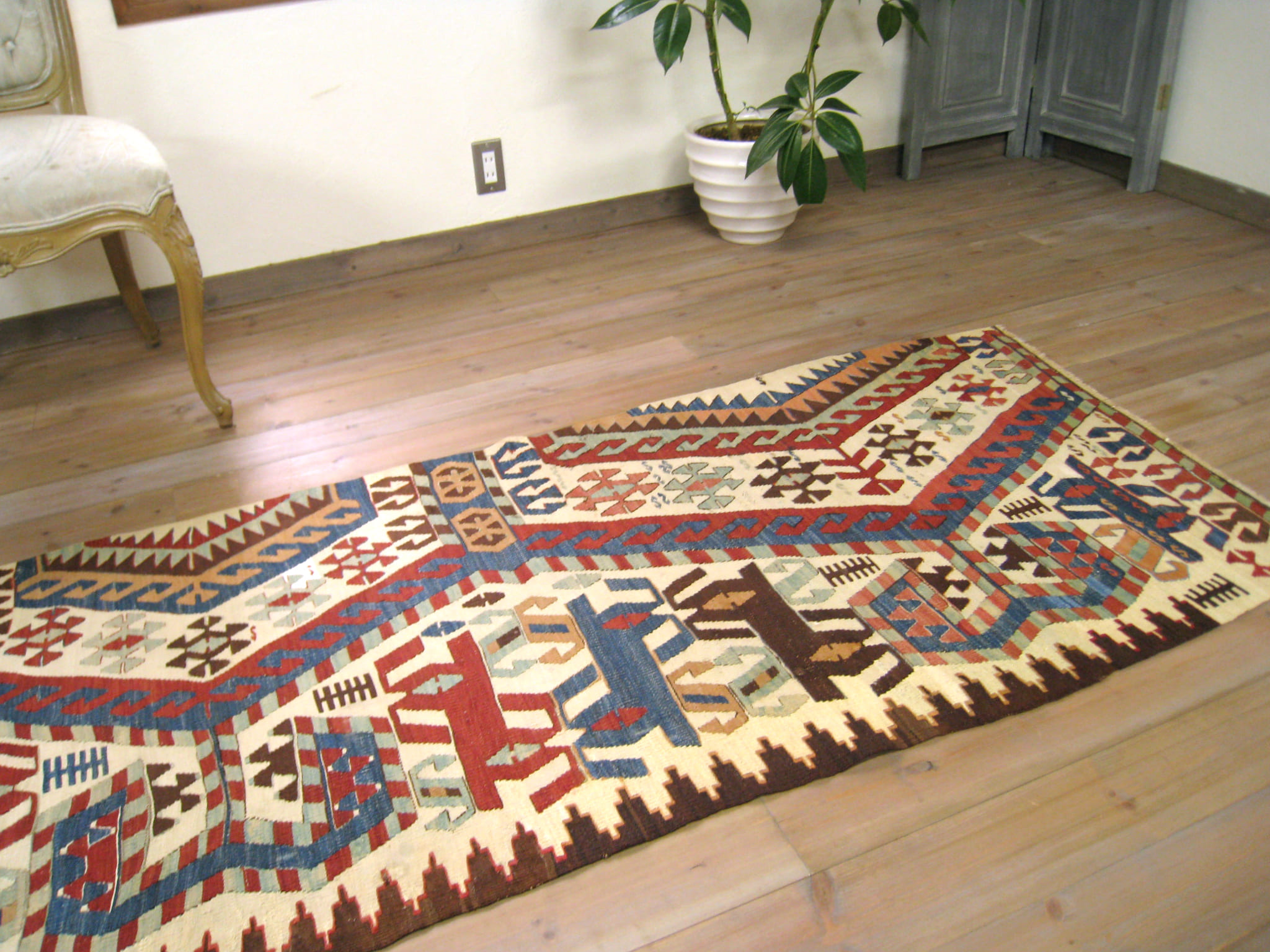 アナトリア西部、アイドゥン地方で織られたチフカナットキリムの半分です。地中海に面したトルコ西部は、19世紀中頃にはすでにヨーロッパからコレクションのためにキリムを買い求めに多くのバイヤーが入り込んできた地域でもあり、20世紀の早い時期にはすでに状態のよいキリムはほとんどヨーロッパに流出してしまったと言われています。(バイヤーといっても生活道具のキリムですから、物々交換で手渡してしまっていたようです)