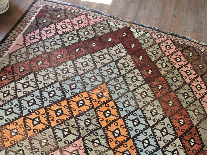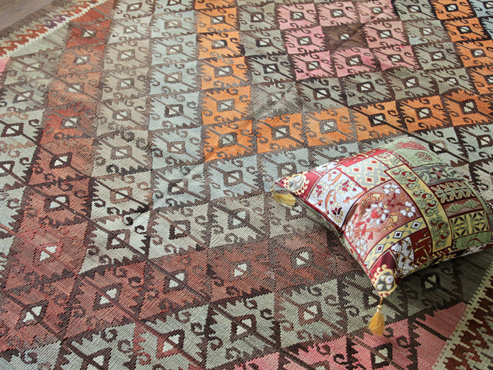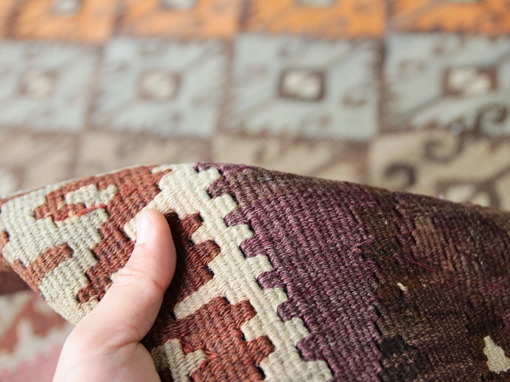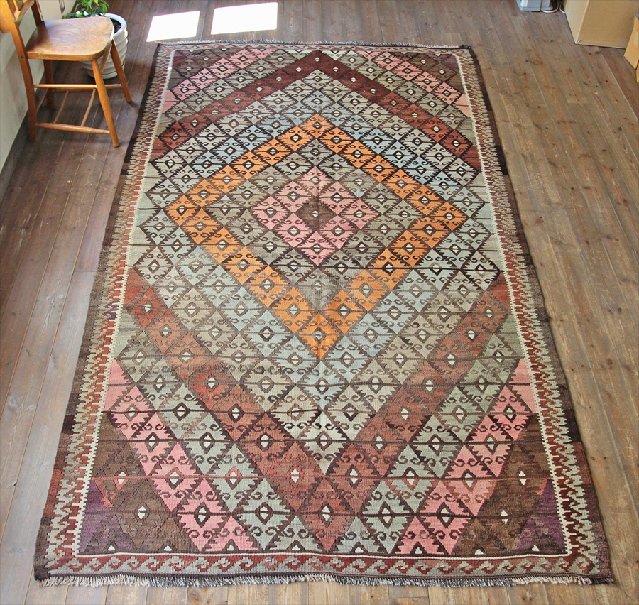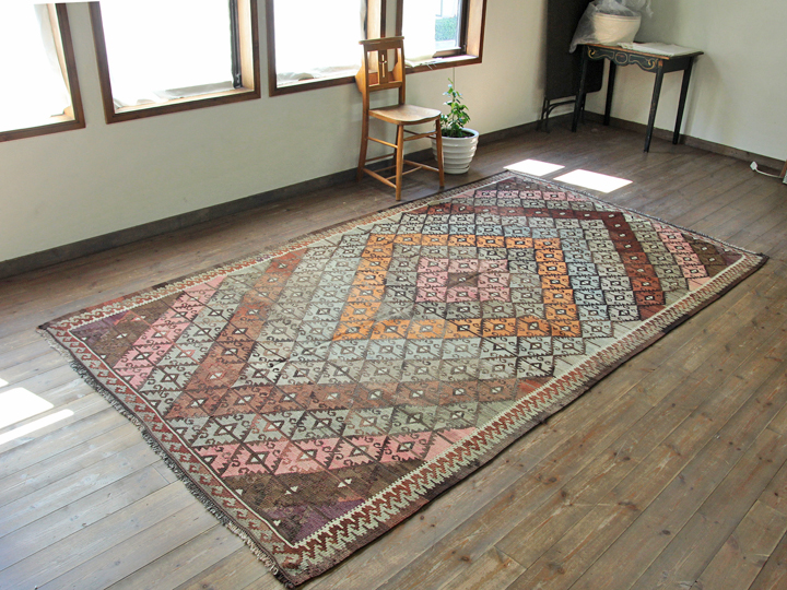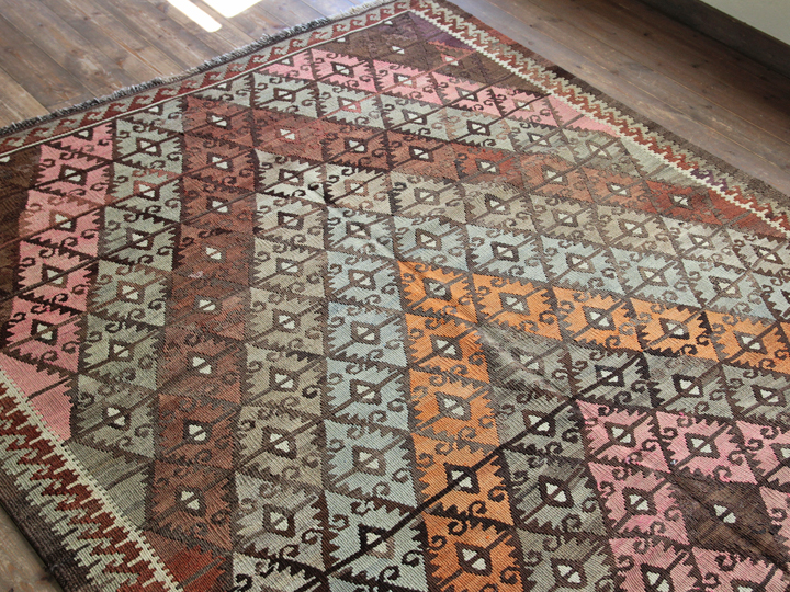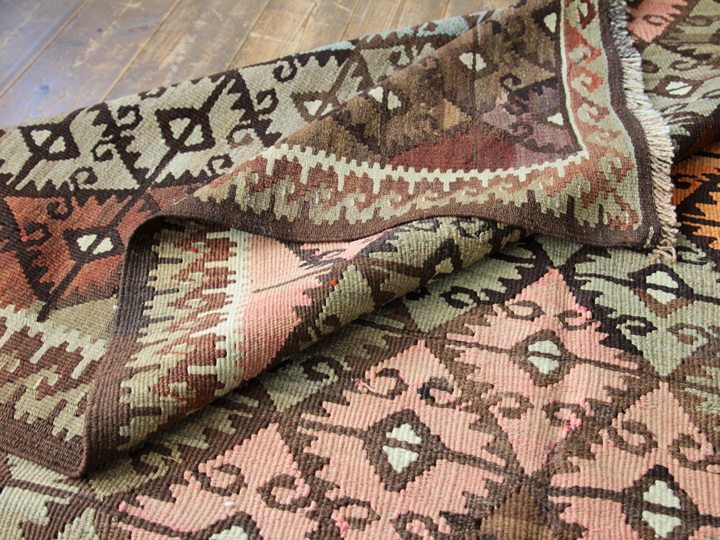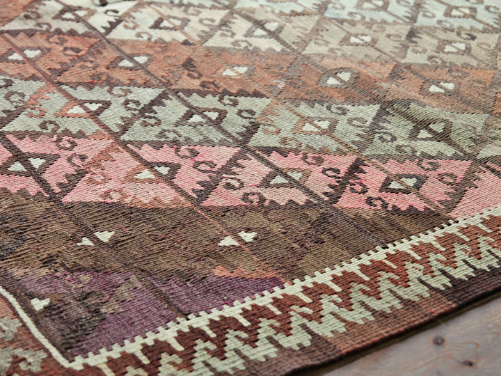 トルコ東北部、アルメニアとの国境に近いカルス地方のキリム。カルスキリムは、太い糸を使った厚みのある織りと、ブラウンやオレンジを使った温かみのある色使いが特徴です。この大型キリムは、少し灰色がかったブラウンをベースに、カラフルなエリベリンデ(女性が腰に手を当てている姿のモチーフ)が一面に織り込まれた、バランスの取れた美しいデザイン。厚みのあるボリュームたっぷりの存在感ある一枚です。