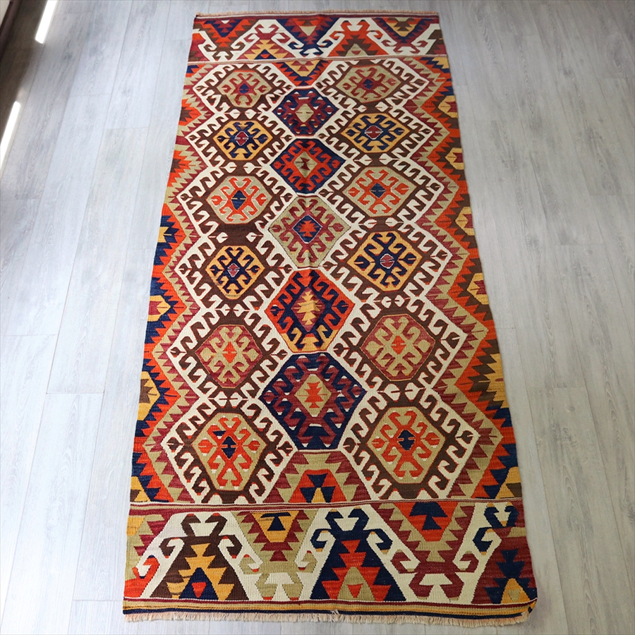 たくさんの爪を持つドラゴンモチーフが並ぶ、南トルコらしい鮮やかなカラーリングのムートキリム。ほとんど織られた当時のままの色が残っていて、とてもきれいなピースです。