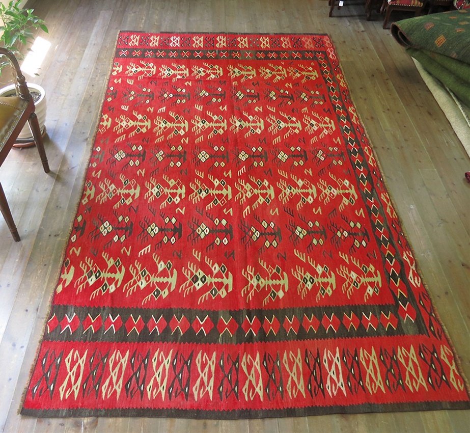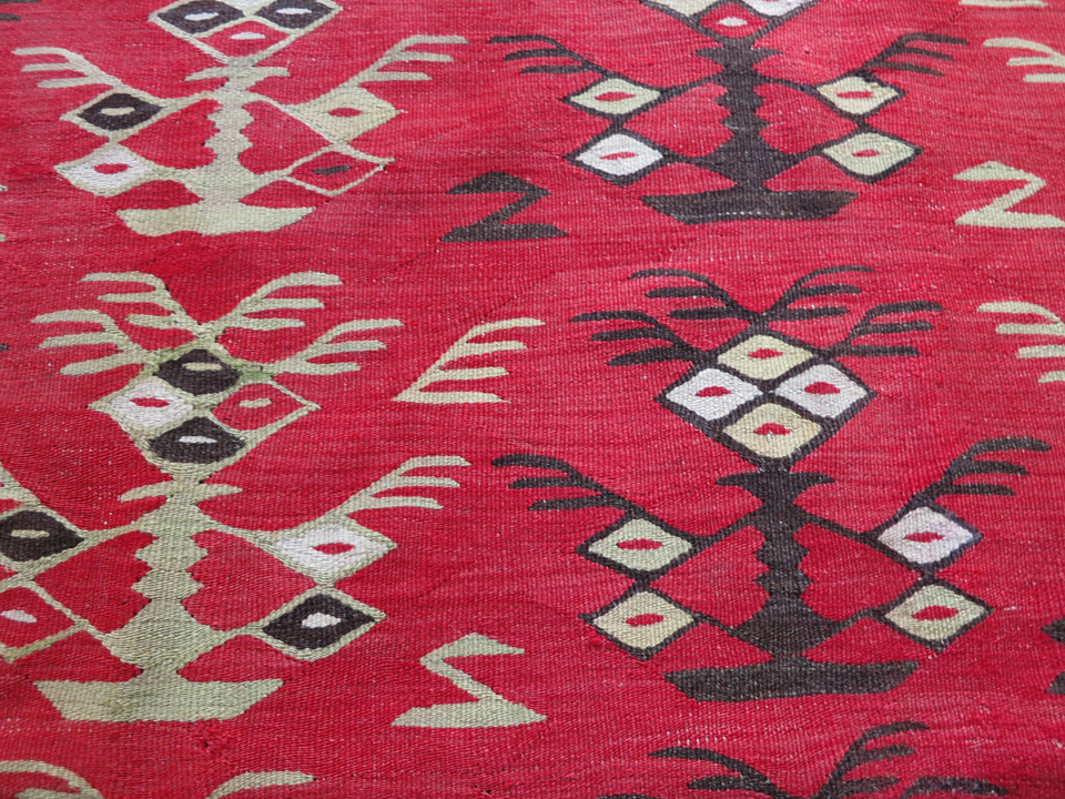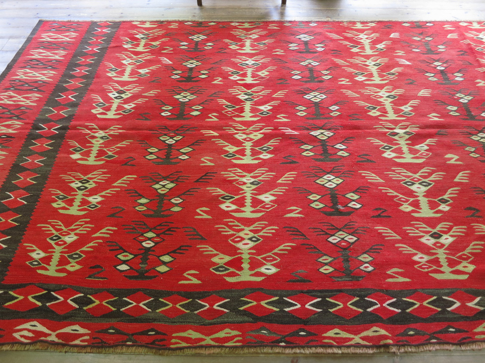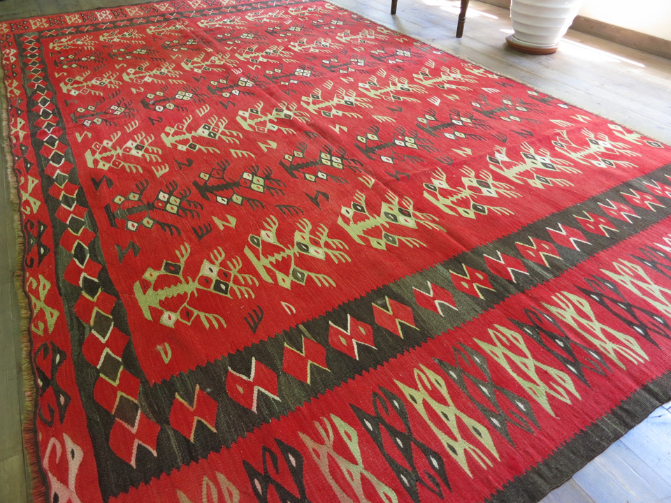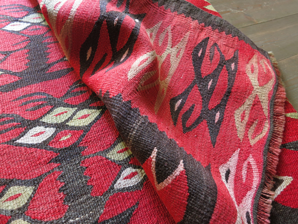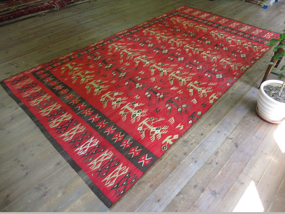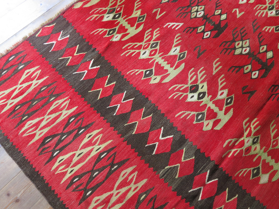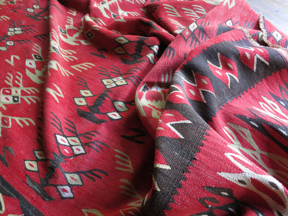 はっとするような朱色をベースに、薄いピスタチオグリーンとブラックで描かれた生命の樹とそこに宿る鳥のモチーフ。シャルキョイ地方の伝統的なデザインで、もともとはほとんど正方形に近い大型のキリムでした。私たちが見せてもらったときにはすでに2枚に切り分けられていたのですが、どうやら家族の形見分けのときに2等分されたもののようです。とてもコンディションのよい状態なのに、カットされてしまって、ちょっともったいないですね。
