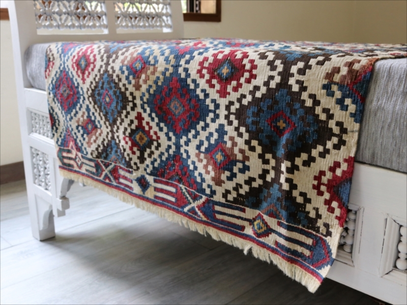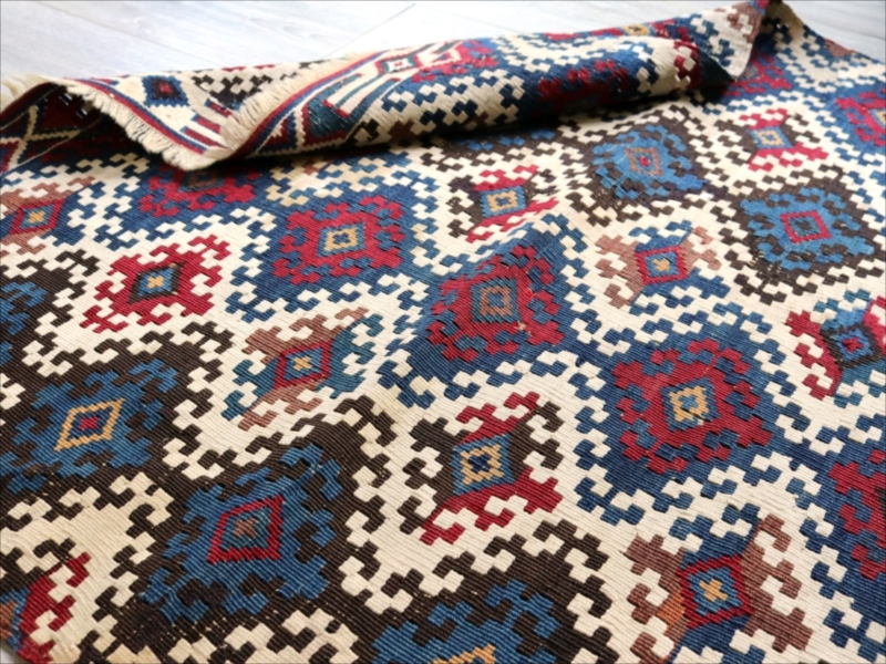 二つに折って袋として縫い合わせて使うために織られたキリムで、オリジナルはおそらく左右二対になっていたものです。厳密にはわかりませんが、ほぼ全ての色が天然染料の染めといってよいかと思います。100年を経過した現在でも、しっかりとした鮮やかな色が残っています。