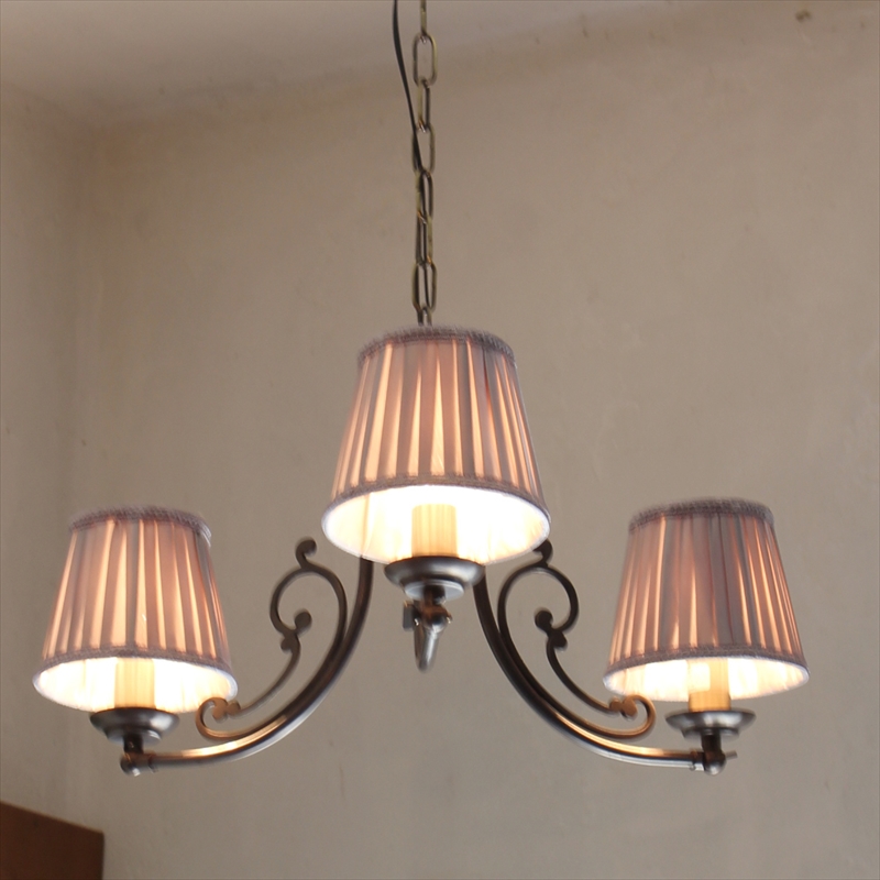 レトロなアールヌーボー風の真鍮ボディに、3灯のロウソク形の電球を合わせたシャンデリアです。布シェードは、直径3?3.5cm程度の電球(シャンデリア球、ミニクリプトン球など)を挟んで設置するタイプです。