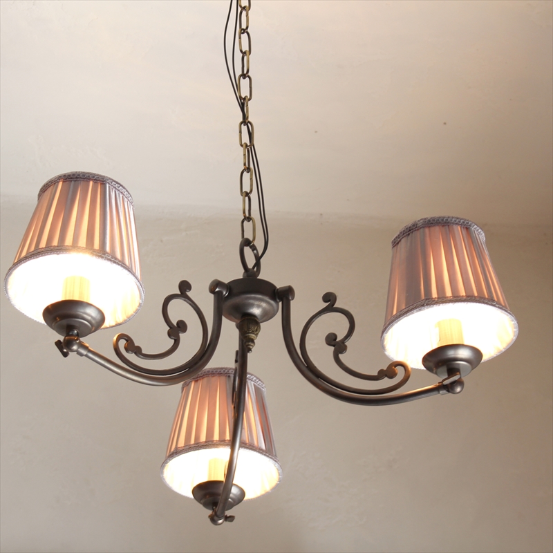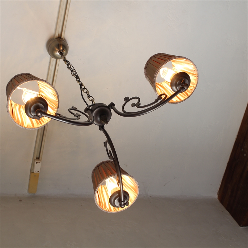 シャンデリア3灯 真鍮製アンティークブロンズ布シェード ココアブラウン