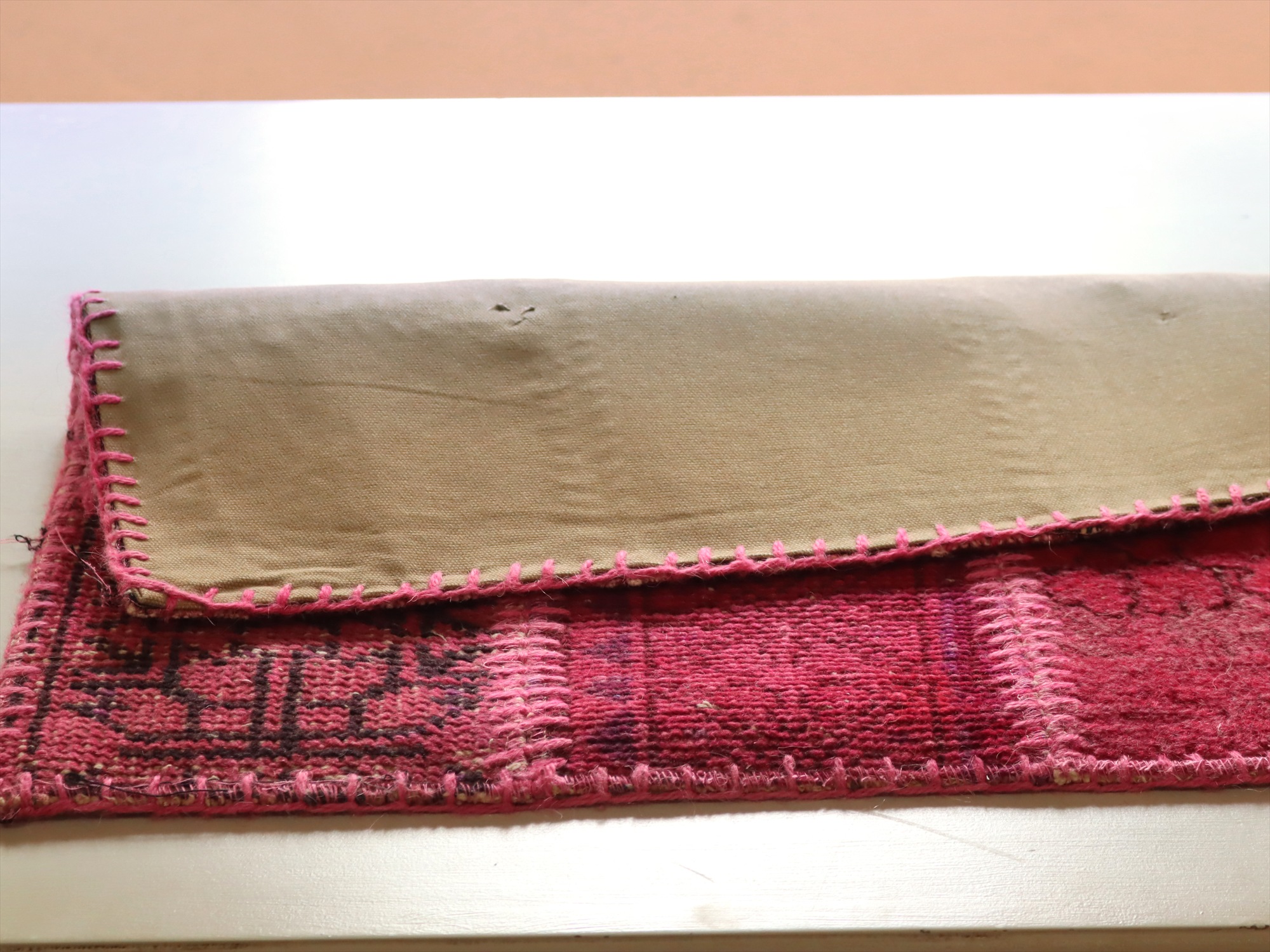 ダメージが多く、使われなくなった古い手織りカーペットを仕立て直したパッチワーク・ラグです。当店では、アナトリア(トルコ地方)のオールドカーペットのみを使い、縫い合わせ部分もミシンを使わず、手作業ではぎ合わせてあります。裏面にはコットン地が張り合わされています。ラグ(カーペット)自体は、パイル(毛足)が擦り減っているところなどが多々ありますが、使い古したラグならではの風合いとご理解ください。